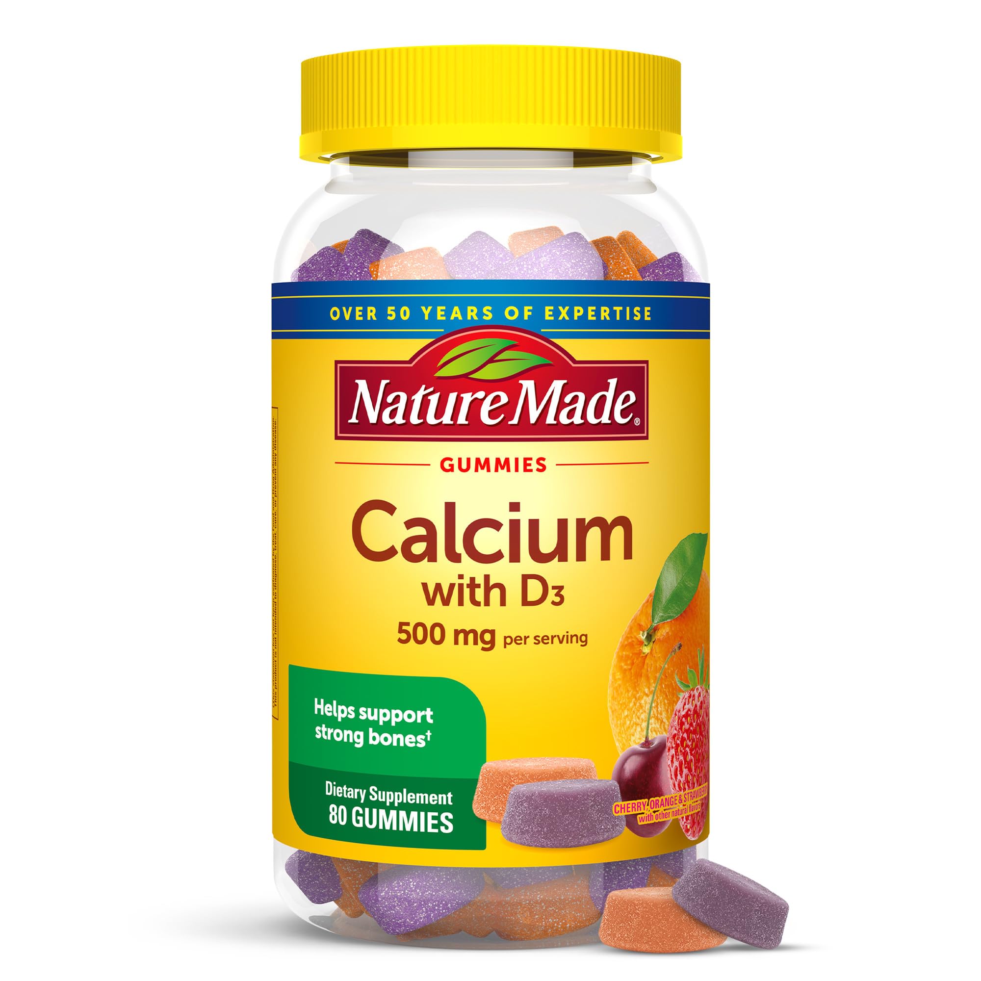 Product DescriptionNature Made Calcium 500 mg per serving with Vitamin D3 is a gummy Calcium supplement that helps support strong bones. These Calcium Vitamin D3 gummy dietary supplements also include Vitamin D, which helps improve Calcium absorption. Sourced from high quality ingredients, this gluten free dietary supplement is a Calcium gummy vitamin that has no high fructose corn syrup, no synthetic dyes, no artificial flavors and no artificial sweeteners. Made with delicious cherry, orange and strawberry flavors, these Calcium 500mg per serving gummy vitamins are a tasty way to get the Calcium and Vitamin D3 supplements you need. For those who don’t receive enough Calcium in their diet and are looking for bone supplements, these Nature Made Calcium supplements can help. Adults chew two Calcium gummies daily. Nature Made supplements are quality you can trust.Brand StoryBy