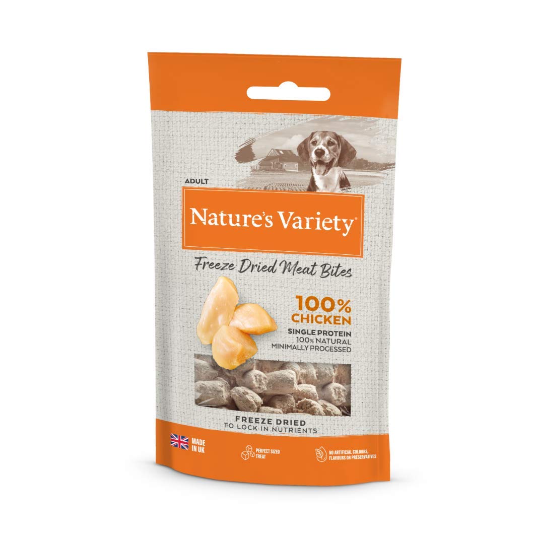 Product DescriptionDelicious dog treats made from 100% premium quality chicken. Freeze-dried to lock-in the goodness and intense meaty flavour your dog will love. Easy to store and perfect for walkies. The ultimate reward for your dog, nothing but 100% quality chicken freeze-dried into bite-sized dog treats that are full of flavour. Freeze-drying is a safe and extremely gentle food process that preserves all the flavour and goodness of the quality meat we use. The result is an incredibly nutritious treat that’s extra tasty as the process intensifies the meaty flavours dogs love. What’s more, Nature’s Variety Freeze Dried Bites can be enjoyed straight from the pack, with no refrigeration needed. Suitable for adult dogs and puppies alike. Comes in a convenient re-sealable pack.IngredientsChicken 100%DirectionsUse as a healthy and tasty treat for your dog or as a topper for your wet or dry dog food. Give up to 5 pieces per 10kg of bodyweight daily. Plenty of fresh drinking water should always be available.Safety WarningAlways wash hands after useBox ContainsNatures Menu Dog True Instinct Freeze Dried Chicken Meat Bites 12X20g