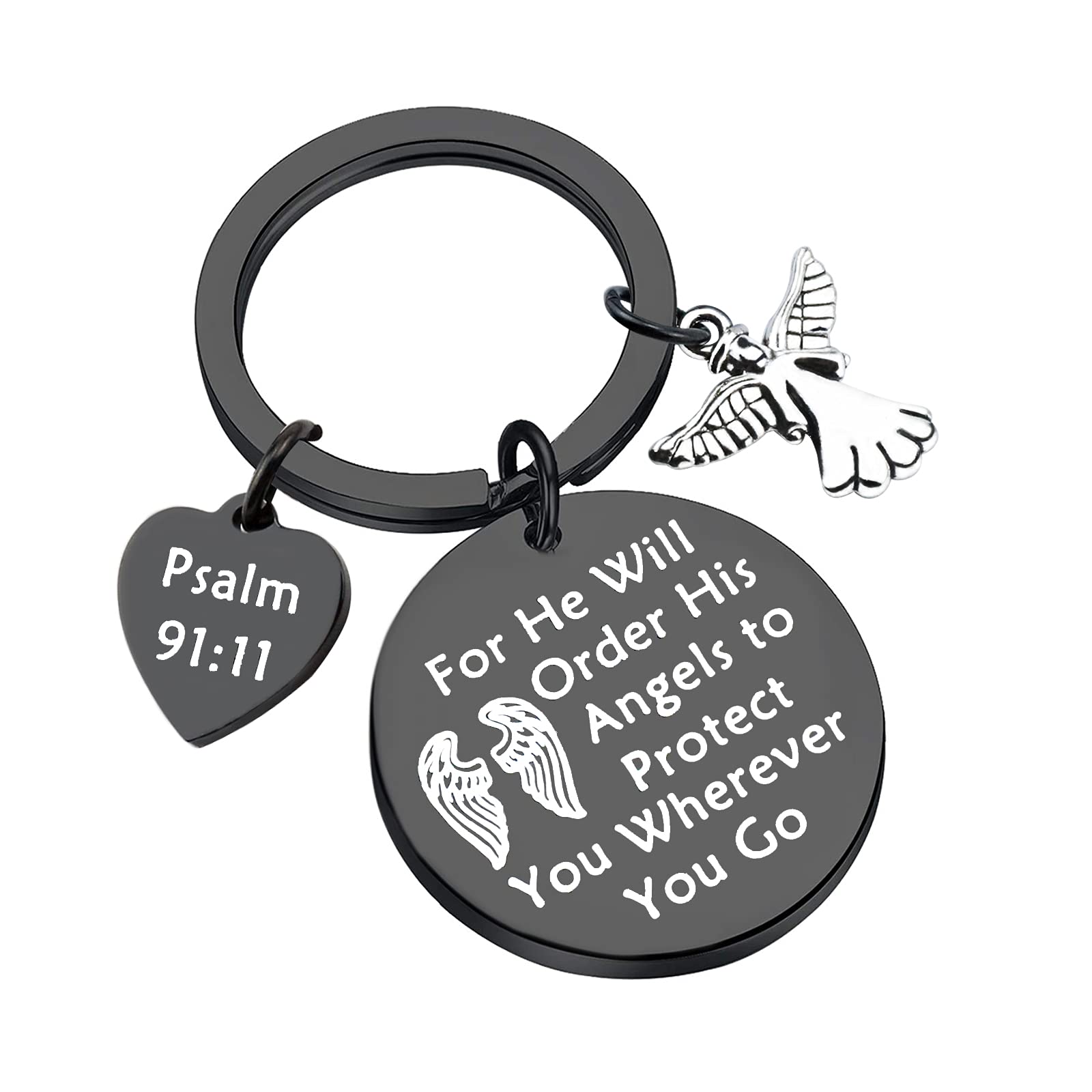 NC Bible Verse Keychain for He Will Order His Angels to Protect You Wherever You Go Religious Jewelry Christian Gift (black)