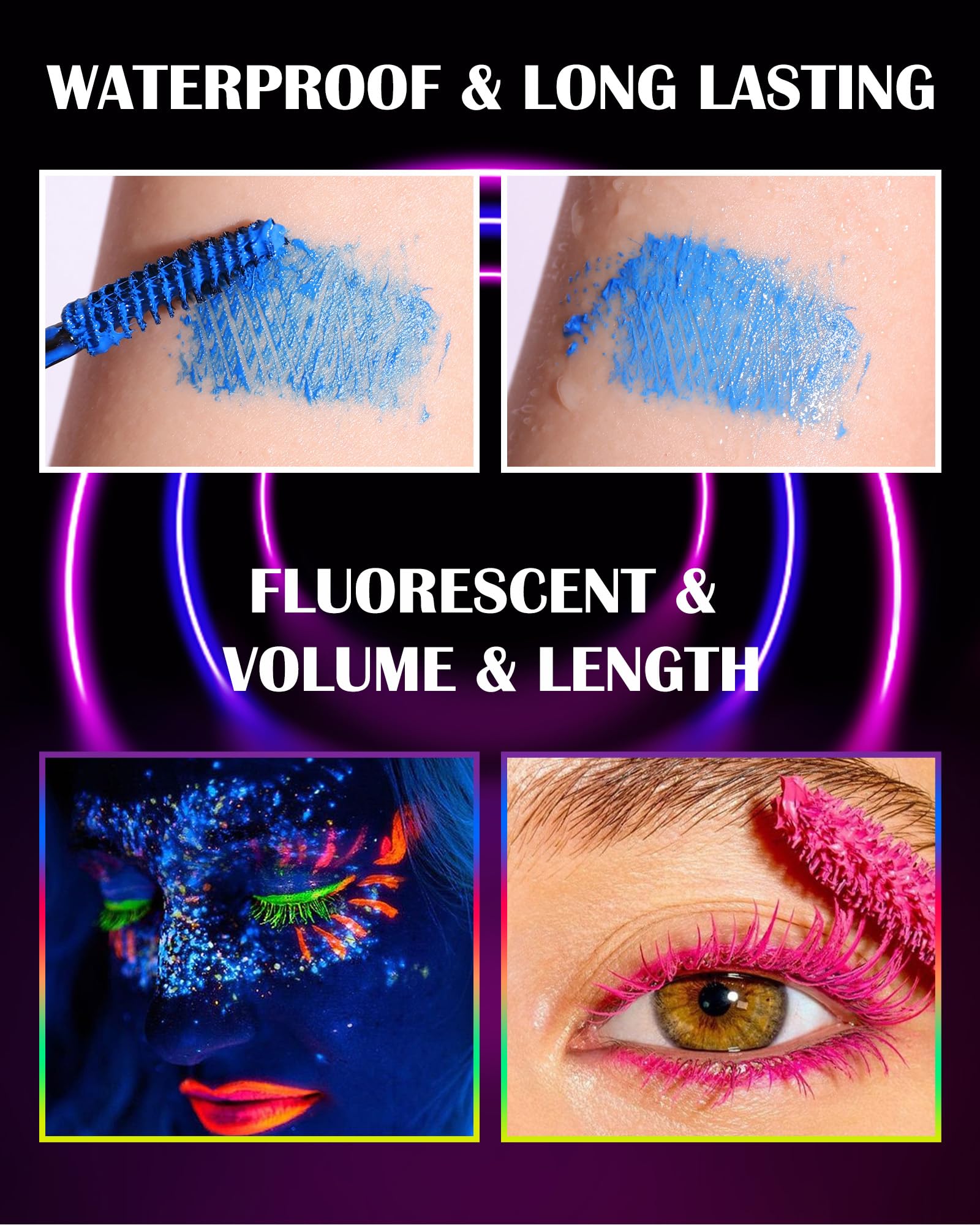 6 Color Set Colored Mascara Neon Mascara-Yellow Green Orange Pink Blue Purple Waterproof Smudge-proof Long Lasting UV Glow Mascara, Colorful Fluorescent Mascara, Fast Dry Eyelash Defining, Great for Cat-Eye Effect, Great for Nights Out, Halloween Parties Stage Holiday Birthday Use, Woman and Girl Gift