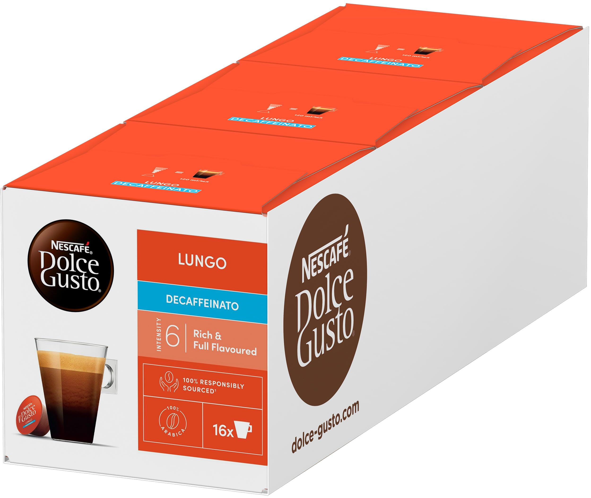 DescriptionProduct DescriptionEnjoying a great tasting coffee doesn’t mean you need to have all of the caffeine too. Our Lungo Decaf is just as smooth and tasty as the original, but it is made with a decaffeinated coffee blend. So whether it’s late in the evening or you just don’t fancy the caffeine, you can enjoy our popular Lungo without putting taste to one side. If you like to slow down and indulge a little more, this is your perfect companion. Lungo is the ideal size for your morning routine or anytime you want to sit back and sip a little more. Brazil, Colombia, Ethiopia - three world-class Arabicas to let you travel through the most famous coffee countries. An amazing coffee tour, isn't it? Thanks to our Grown Respectfully program, we are helping farmers and their communities improve the health and quality of their livelihoods while enhancing the productivity of their crops and being kinder to the planet. Each pack contains 16 capsules of NESCAFE Dolce Gusto Lungo Decaf pods and it's Dolce Gusto machine compatible capsules. Ingredients: Coffee decaffeinated (100 Percent).Ingredientsbrazil - colombiaBox ContainsEach order comes with 3 x Nescaf? Dolce Gusto Lungo Decaffeinated 16 Capsules