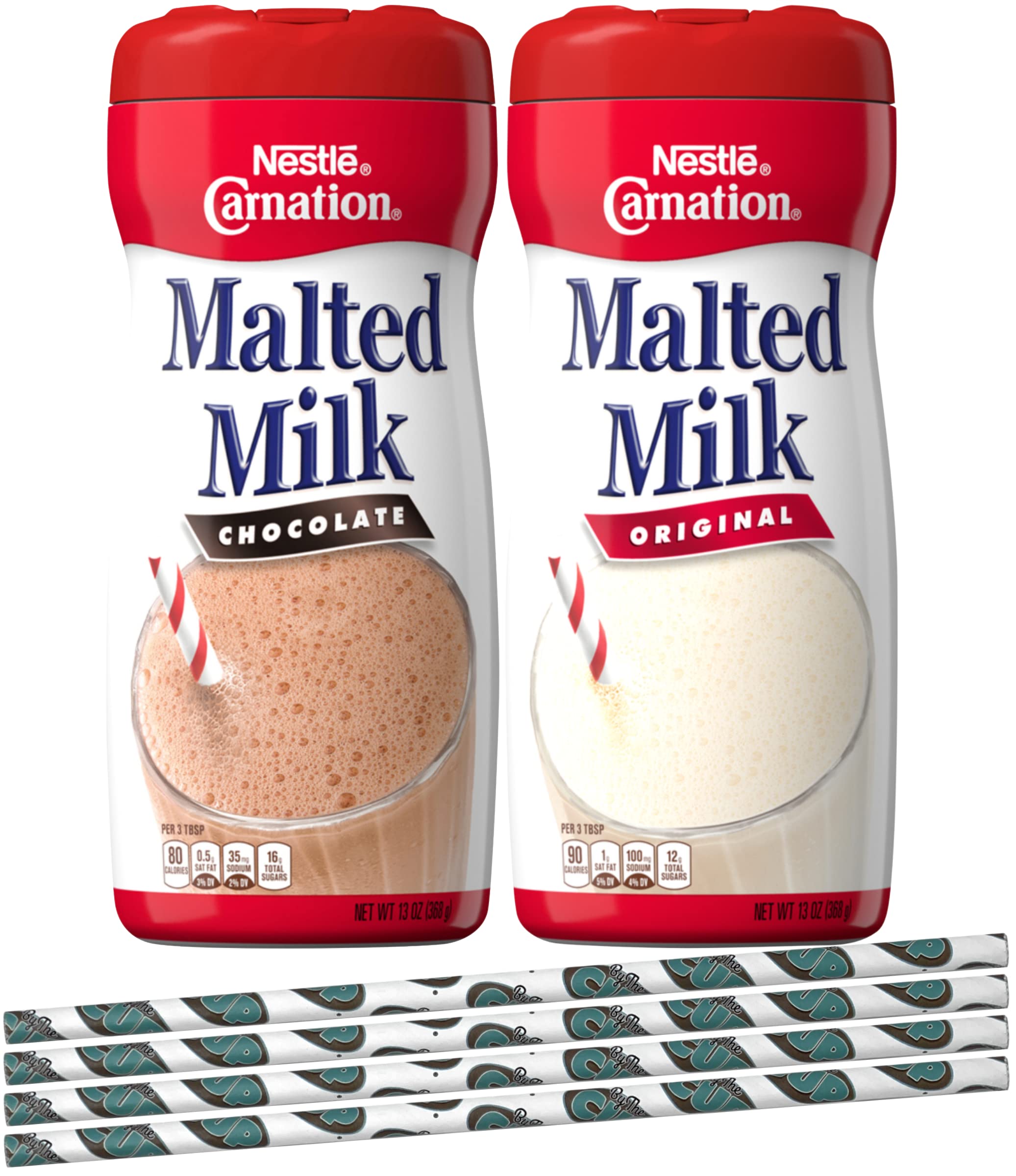 Nestle Carnation Powdered Malted Milk Variety, Original & Chocolate, 1 of Each with By The Cup Paper Straws