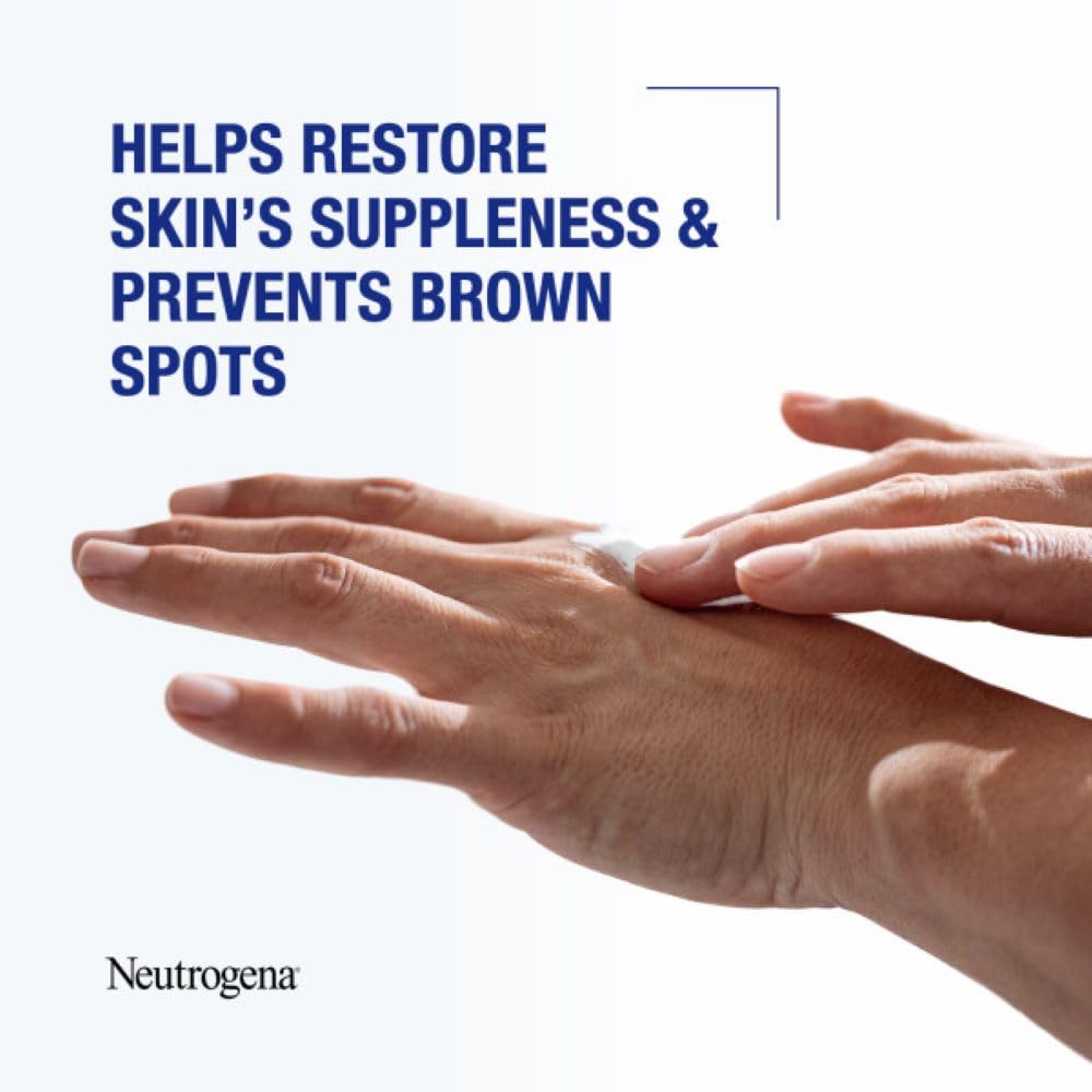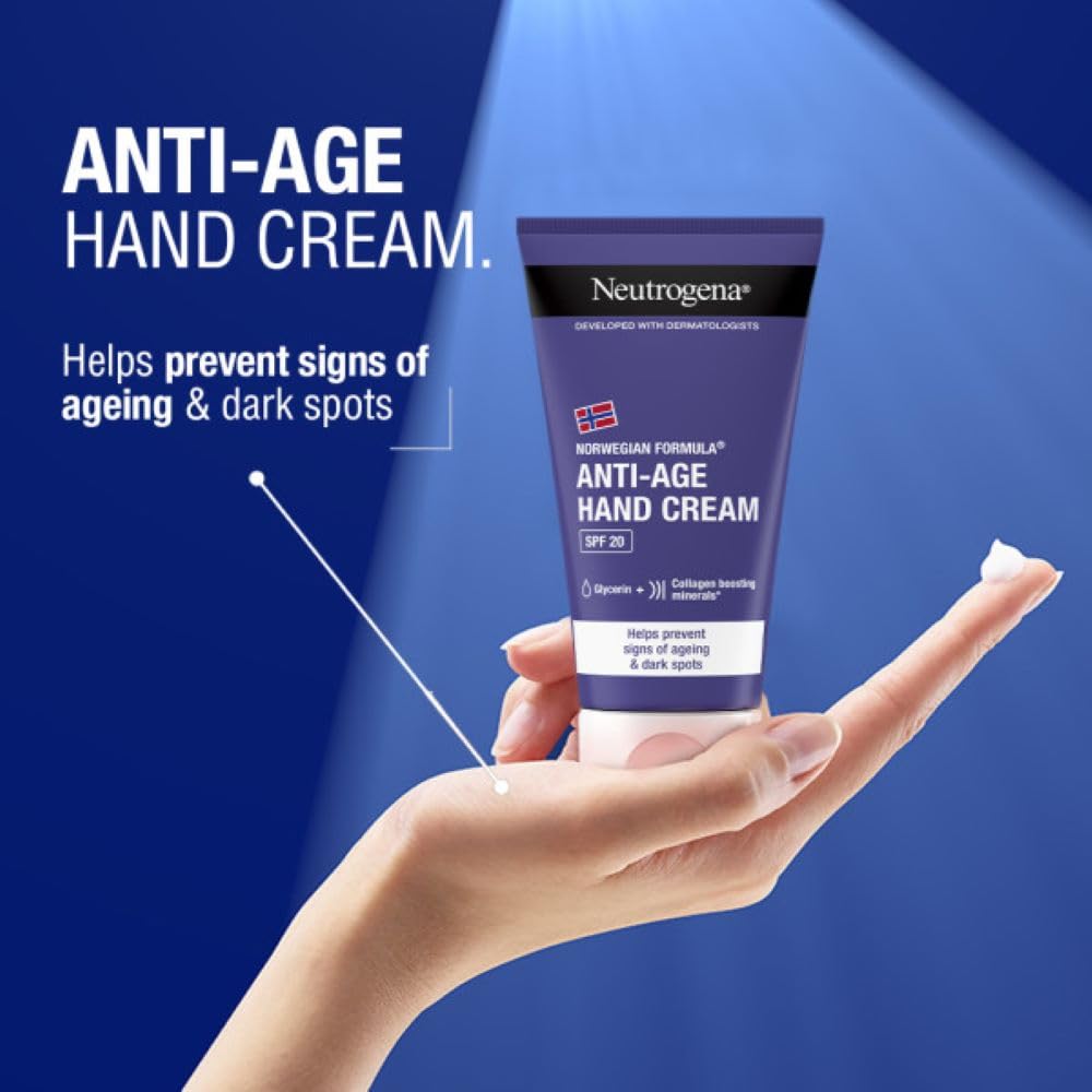 NEUTROGENA® Norwegian Formula Anti-Age Hand Cream provides intense hydration, helps restore skin's suppleness and prevents the appearance of brown spots. Combines Norwegian Formula moisture with active minerals, which helps boost skin's own collagen production*. Fast-absorbing texture. *in-vitroIngredientsOther Ingredients: Aqua, Glycerin, Dicaprylyl Carbonate, Homosalate, Dimethicone, Buthyl Methoxydibenzoylmethane, Octocrylene, Steareth-2, Butylene Glycol, Butyrospermum Parkii BUTTER, Squalane, Sorbian Stearate, Steareth-21, Leontopodium Alpinum Extract, Magnesium Aspartate, Zinc Gluconate, Copper Gluconate, Mica, Titanium Dioxide, Lignoceryl Alcohol, Arachidyl Alcohol, Linseed Acid, Behenyl Alcohol, Caprylyl Glycol, Isohexadecane, Sucrose Cocoate, Aluminum Starch Octenylsuccinate, Sodium Dodecylbenzenesulfonate, Stearyl Alcohol, Cetyl Alcohol, PEG-8 Laurate, Polysorbate 60, Styrene/Acrylates Copolymer, Dimethicone Crosspolymer, Hydroxyethyl Acrylate/Sodium Acryloyldimethyl Taurate Copolymer, Xanthan Gum, Acrylates Copolymer, Polymethyl Methacrylate, Acrylates/C10-30 Alkyl Acrylate Crosspolymer, Alcohol, Disodium EDTA, Caprylhydroxamic Acid, Sodium Hydroxide, Tocopherol, Phenoxyethanol, Parfum. [PR-015233]Box Contains1 x Neutrogena Visibly Renew Hand Cream 75 mlManufacturer Contact InformationJohnson & Johnson Ltd 50-100 Holmers Farm Way High Wycombe HP12 4EG UK