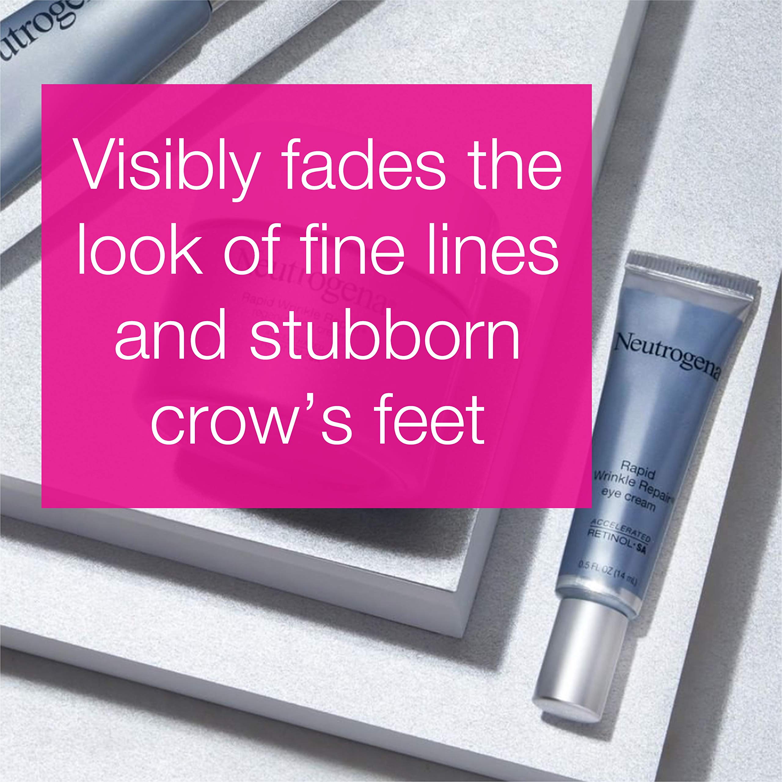 Product DescriptionTarget crow's feet, fine lines and dark circles with Neutrogena Rapid Wrinkle Repair Retinol Anti-Wrinkle Eye Cream. Specially formulated for the delicate eye area, the retinol cream is suitable for daily use and helps fade the look of fine lines and stubborn crow's feet and brightens and evens the look of skin in the under-eye area. Perfect for use in a daily skincare routine, anti-aging formula contains retinol, a powerful dermatologist-proven form of vitamin A, to fight fine lines, dullness, wrinkles and dark spots. Our eye cream is formulated with pure retinol, which is scientifically proven superior to commonly used retinyl esters. Hyaluronic acid within this eye cream adds plumping moisture to help hydrate and rejuvenate the look of skin around the eyes. This dark circle targeting retinol cream is formulated without parabens, mineral oil, and dyes and comes from the #1 retinol brand used most by dermatologists.Brand StoryBy