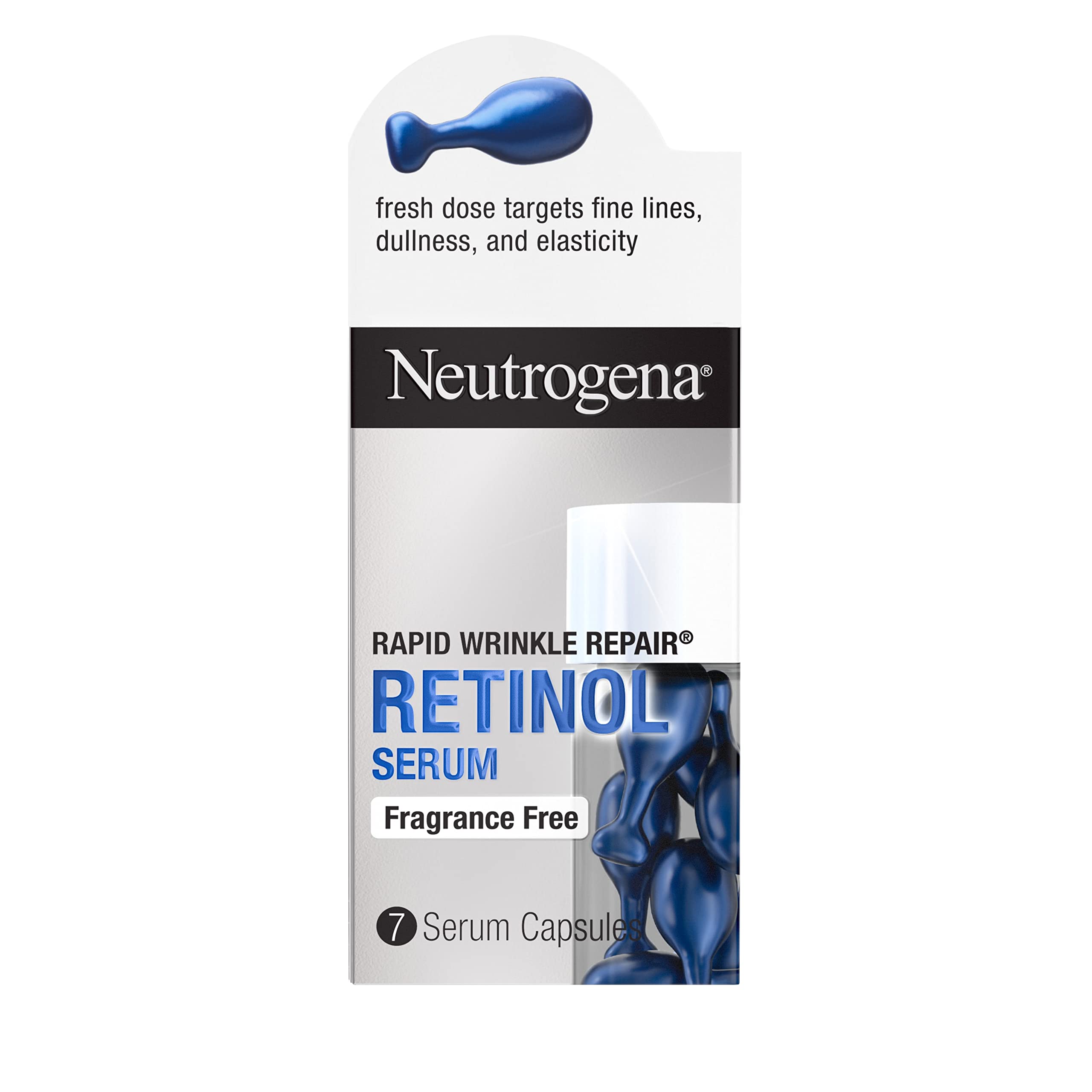 Target fine lines, dullness, wrinkles, and skin elasticity with Neutrogena Rapid Wrinkle Repair Retinol Face Serum Capsules. These facial serum capsules are clinically proven to improve the look of wrinkles in 4 weeks. Giving you instantly softer smoother skin, and more supple, radiant, and revitalized-looking skin in just one week. Each anti-aging serum capsule contains a fresh dose of retinol that is suitable for all skin tones and types. Pure retinol, a dermatologist-proven form of vitamin A that fights fine lines, wrinkles, and dark spots. The water biodegradable, seaweed-based capsules provide easy to use, mess-free application at home or on the go, and the lightweight and non-greasy serum is hypoallergenic and free from fragrance, alcohol, mineral oil, parabens, and silicone. To use, gently twist and pull to open the retinol capsule and smooth over freshly cleansed skin. Enhance your anti-aging routine by following the serum with Rapid Wrinkle Repair Retinol Regenerating Cream.