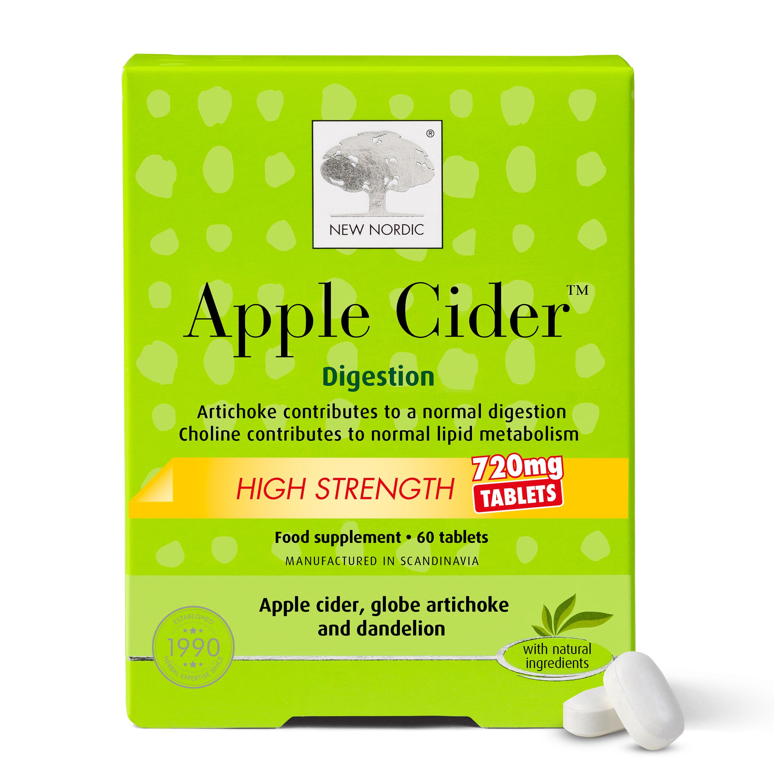 Product DescriptionSize name: pack of 1 product Description New Nordic Ltd ltd Ltd Ltd 720 mg apple cider high strength 60 tablets help to manage their fluid levels and break down of fats in the digestive system. The tablets are based on a Swedish apple cider formula with artichoke and dandelion. The tablets contents of dandelion help maintain a healthy fluid output. Ingredients apple cider vinegar. See all Product description.IngredientsApple cider vinegar powder, Choline Hydrogentartrate, globe artichoke (Cynara scolymus L.), dandelion (Taraxacum officinalis Web.), glazing agents (magnesium stearate, hydroxypropyl methylcellulose), bulking agent (di-calcium phosphate crosslinked sodiumcarboxy-methyl cellulose), anticaking agent (silicon dioxide).Directions2-3 tablets with a glass of water at breakfast.Safety WarningDo not exceed the recommended daily dosage indicated The product should be stored out of reach of children The food supplement should not replace a varied and healthy dietBox Contains1x 60 tablets of Apple Cider High StrengthManufacturer Contact InformationU.K.: New Nordic Ltd, Unit 20 Brough Business Centre, Skillings Lane, Brough, HU15 1EN Ireland: Naturalife Health, 4 & 5 Charvey Business Park, Rathnew, Co.Wicklow