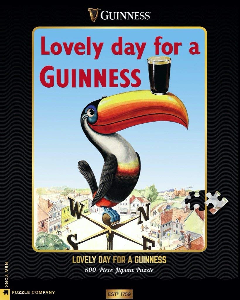 DescriptionGuinness's famous toucan shows skill and poise by bravely balancing a pint of stout on it's beak while perched atop a weather vane! Vintage Guinness Advertisement 500 Piece Jigsaw Puzzle Finished Puzzle Size: 18"x24" Linen Style Finish to reduce glare Made in USA Recommended Age: 10+ Years