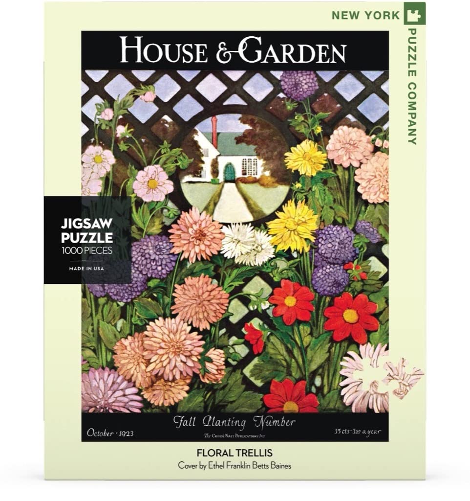 Take a glimpse through this trellis as beautiful blooms climb it. Just beyond, you can see a part of a house in the distance. House & Garden Cover by Artist Ethel Franklin Betts Baines, originally published on October 1st, 1923 1000 Piece Jigsaw Puzzle Finished Puzzle Size: 19.25"x26.625" Linen Style Finish to reduce glare Made in USA Recommended Age: 13+ Years