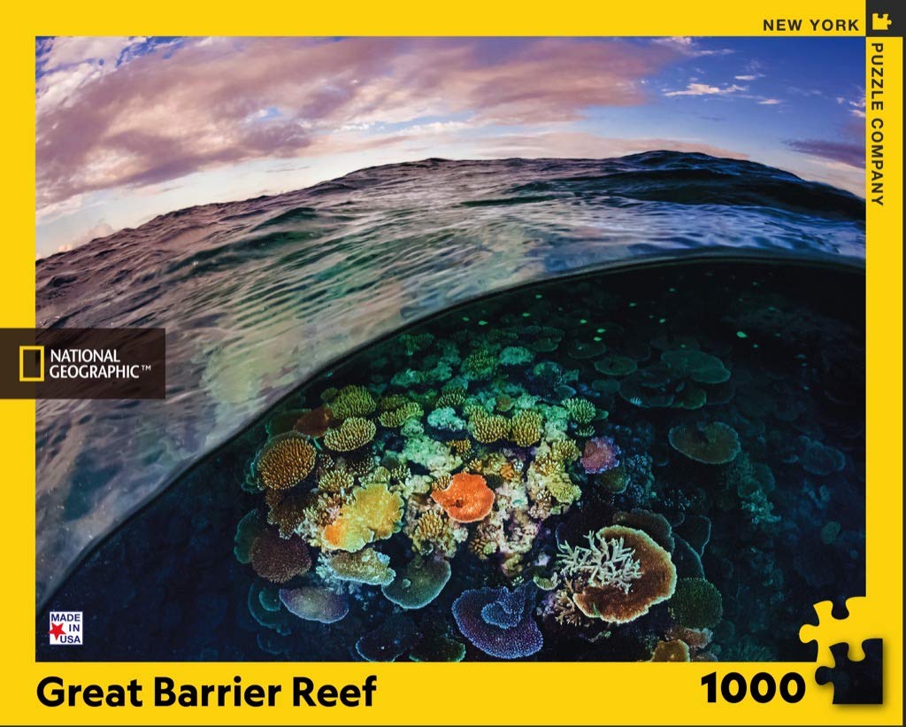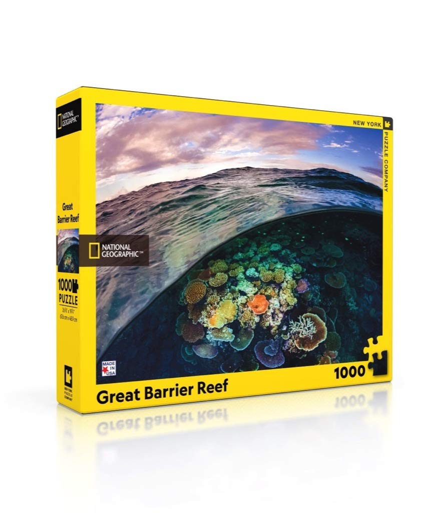 You can spend a lifetime exploring the Great Barrier Reef and still not see all of this colorful coral realm-it’s nearly the size of Montana. Sprawling off the east coast of Queensland, Australia, the Great Barrier Reef is not a single reef but a group of more than 2,800 distinct entities. It stretches over 1,250 miles (2,000 kilometers) north to south and covers some 135,000 square miles (350,000 square kilometers) in total. The reef system is the largest structure on Earth built by living organisms, tiny hard corals that are no bigger than a fingernail. When corals die in countless numbers their limestone-secreted skeletons build upon one another to form the bedrock of the reef. The magnificent structures we see today were produced by a slow process played out over millions of years. Reefs grow only about half an inch (1.3 centimeters) a year. Some 2,000 different fish species have been identified on the Great Barrier Reef, and new ones are found each year. Scientists estimate that the reef is home to 4,000 mollusk species and over 250 different shrimp species. Even the corals that construct the reef itself are diverse-numbering some 400 species. This colorful aquatic ecosystem is home to a staggering diversity of plant and lower animal life but is also frequented by larger species like dugongs, sea turtles, sharks, and dolphins. National Geographic Photography 1000 Piece Jigsaw Puzzle Finished Puzzle Size: 26.625"x19.25" Linen Style Finish to reduce glare Made in USA Recommended Age: 13+ Years