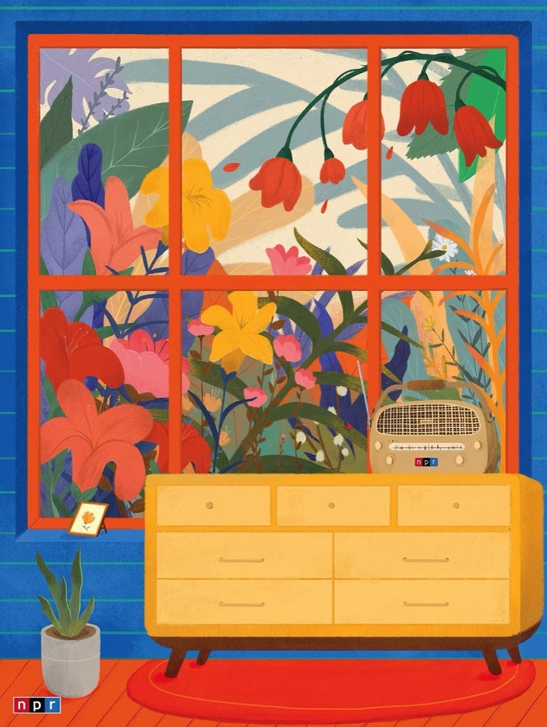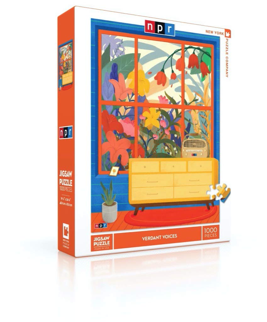 A colorful and bucolic interior finds us looking outside through a large window. A vintage radio sits atop a stylish dresser. And through the window, lush tropical vegetation abounds. Artwork commissioned by National Public Radio 1000 Piece Jigsaw Puzzle Finished Puzzle Size: 19.25"x26.625" Linen Style Finish to reduce glare Made in USA Recommended Age: 13+ Years