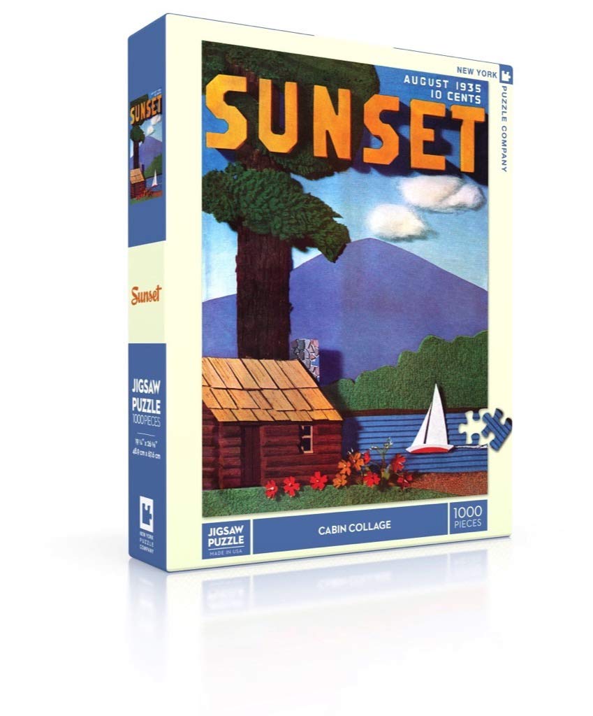 From a Sunset Magazine cover of the early 20th century, a collage of a cozy log cabin with a stone chimney and cheerful red flowers in front sits beneath a huge tree beside a lake with a sailboat gliding by. Sunset Cover, originally published on August 1st, 1935 1000 Piece Jigsaw Puzzle Finished Puzzle Size: 19.25"x26.625" Linen Style Finish to reduce glare Made in USA Recommended Age: 13+ Years