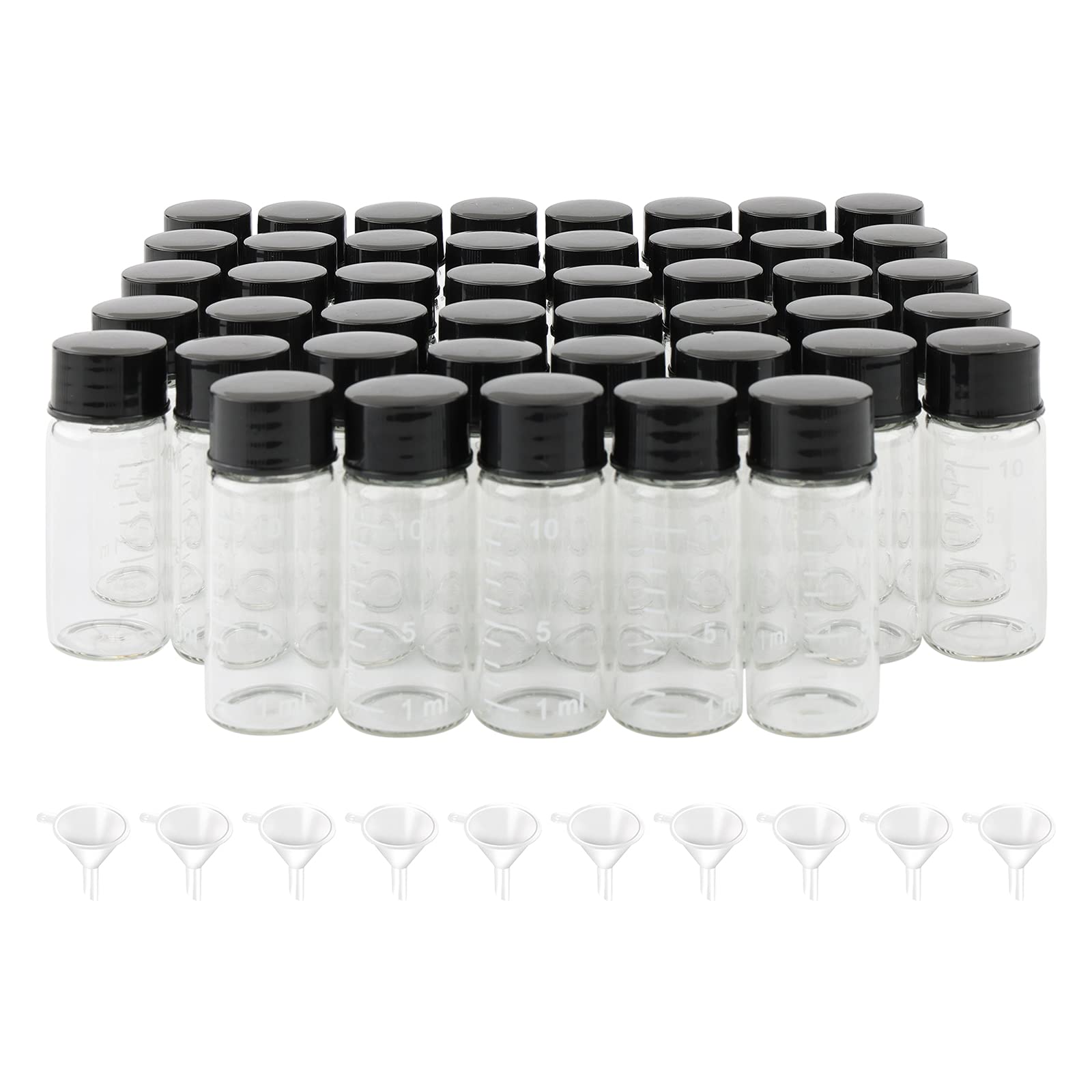 NewZoll 45Pcs Glass Thread Bottles 10ml/ 0.3Oz Clear Glass Sample Sampling Bottles Vials Containers with Graduation & Screwcap, 10 Funnel Include