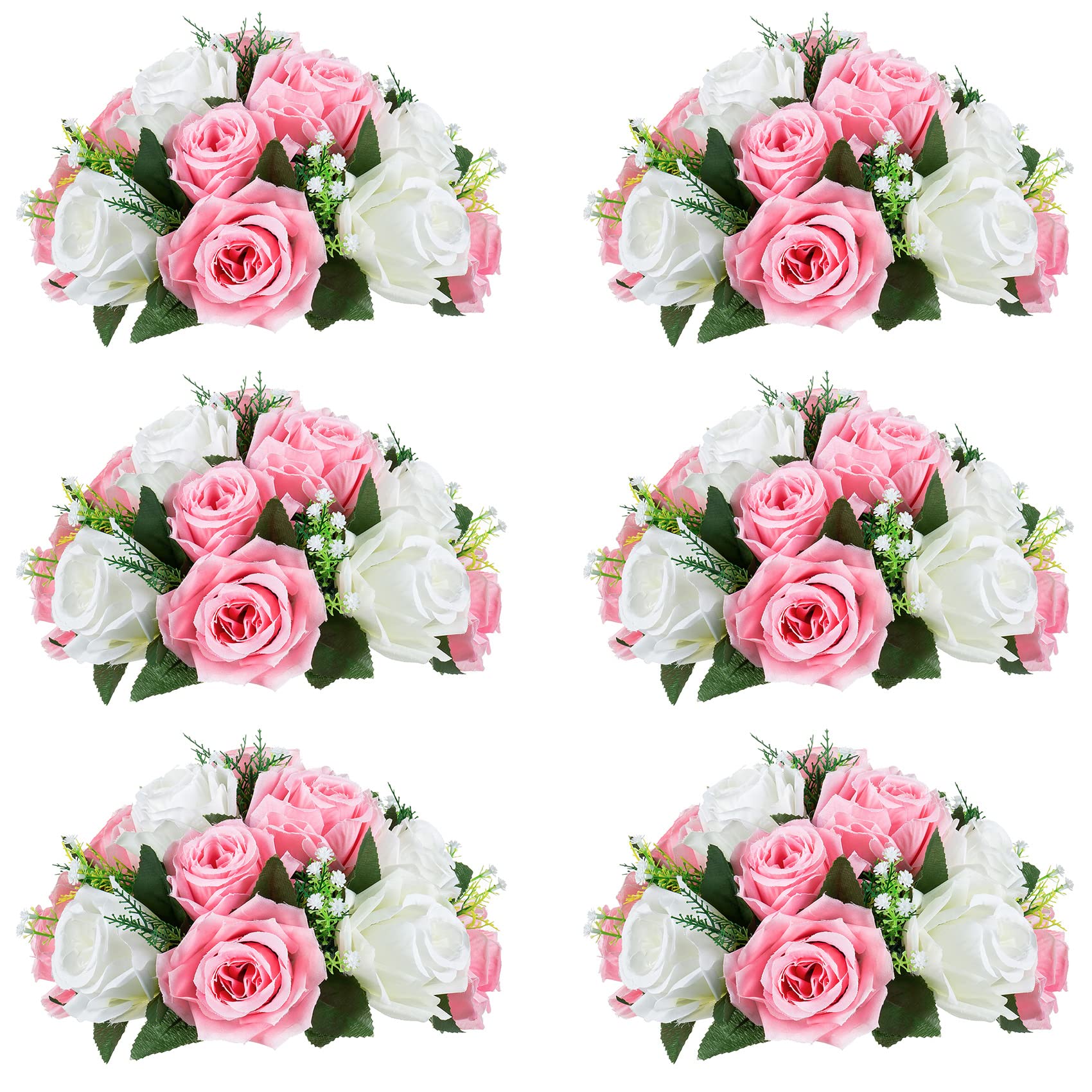 NUPTIO Pcs of 6 Fake Flower Ball Arrangement Bouquet,15 Heads Plastic Roses with Base, Suitable for Our Store's Wedding Centerpiece Flower Rack for Parties Valentine's Day Home Décor (Pink & White)