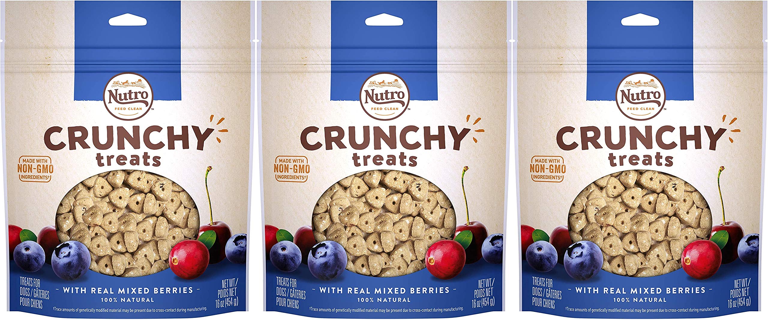 It’s the crunchy treat dogs really want. NUTRO Crunchy Dog Treats with Real Mixed Berries are rich in nutrients, full of flavor, and contain no artificial flavors or colors, no artificial preservatives*, and no corn, wheat, or soy (trace amounts may be present due to potential cross-contact during manufacturing). These healthy treats for your dog are a great way to train your dog, reward good behavior with a treat, or to create a moment of bonding. These delicious treats are made with quality ingredients from around the world that have been carefully sourced from a trusted network of farmers and suppliers. NUTRO is committed to safeguarding the source of natural ingredients by working with farmers to protect and improve soil health so we can continue to grow healthy pets for years to come. To help nourish your dog and help them live an active life, treat them with NUTRO Crunchy Dog Treats.