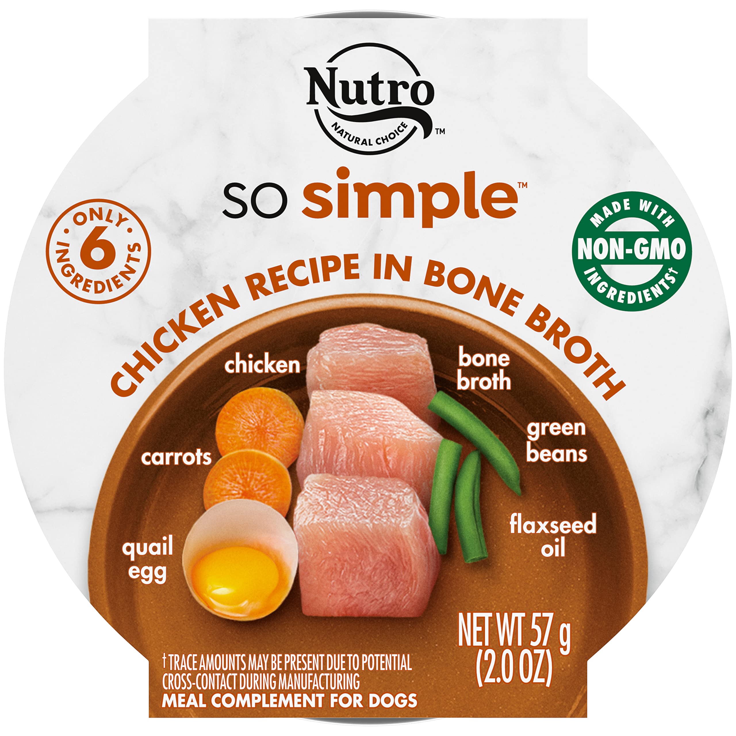 Your dog will do a happy dance when you feed them NUTRO So Simple Wet Dog Meal Complement as a mix-in, topper or snack! This natural dog food is made with only 6 ingredients, including real chicken as the #1 ingredient. The recipe is formulated with non-GMO ingredients*, without grains and no chicken by-product meal, corn, wheat, or soy, and no artificial flavors*, colors* or preservatives.* As part of the NUTRO FEED CLEAN philosophy, this delicious recipe starts with high-quality protein as the first ingredient. Feel great about keeping it simple with this dog food with only a handful of ingredients and lots of flavor.? *Trace amounts may be present due to potential cross-contact during manufacturing.