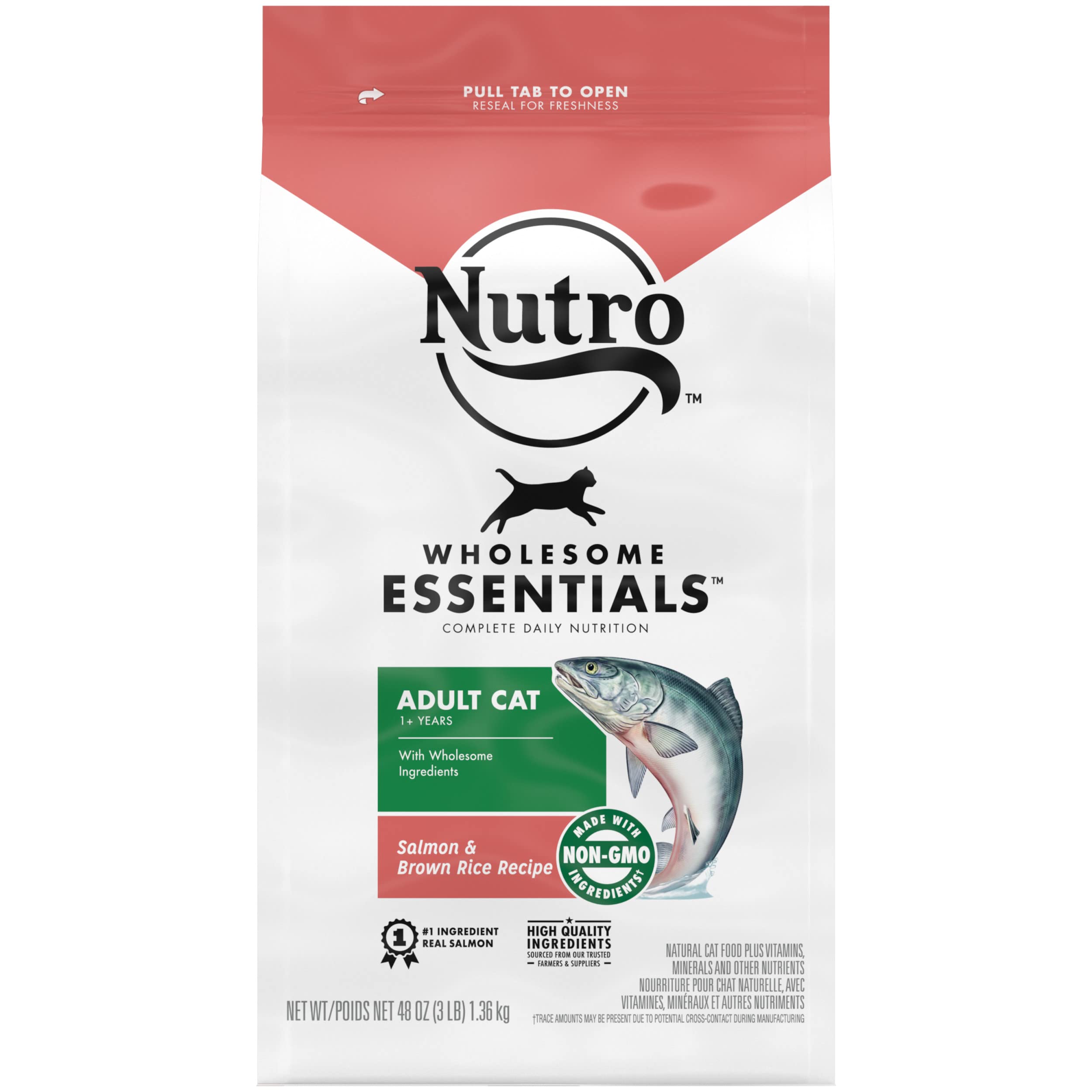 Each NUTRO WHOLESOME ESSENTIALS Dry Cat Food recipe starts with a high-quality protein source and is made with non-GMO ingredients.* This premium natural cat food features real salmon as the #1 ingredient, natural fiber for healthy digestion, and essential antioxidants for a healthy immune system. This kibble is also rich in lean protein and omega-6 fatty acids to support healthy skin and a soft, shiny coat. NUTRO Dry Cat Foods are made with quality ingredients carefully sourced from a trusted network of farmers and suppliers and have no corn, wheat, or soy protein, no chicken by-product meal, and no artificial preservatives, flavors, or colors. Give your adult cat a complete, nutritious meal every time with NUTRO WHOLESOME ESSENTIALS Adult Cat Dry Foods. * Trace amounts of genetically modified material may be present due to potential cross-contact during manufacturing.