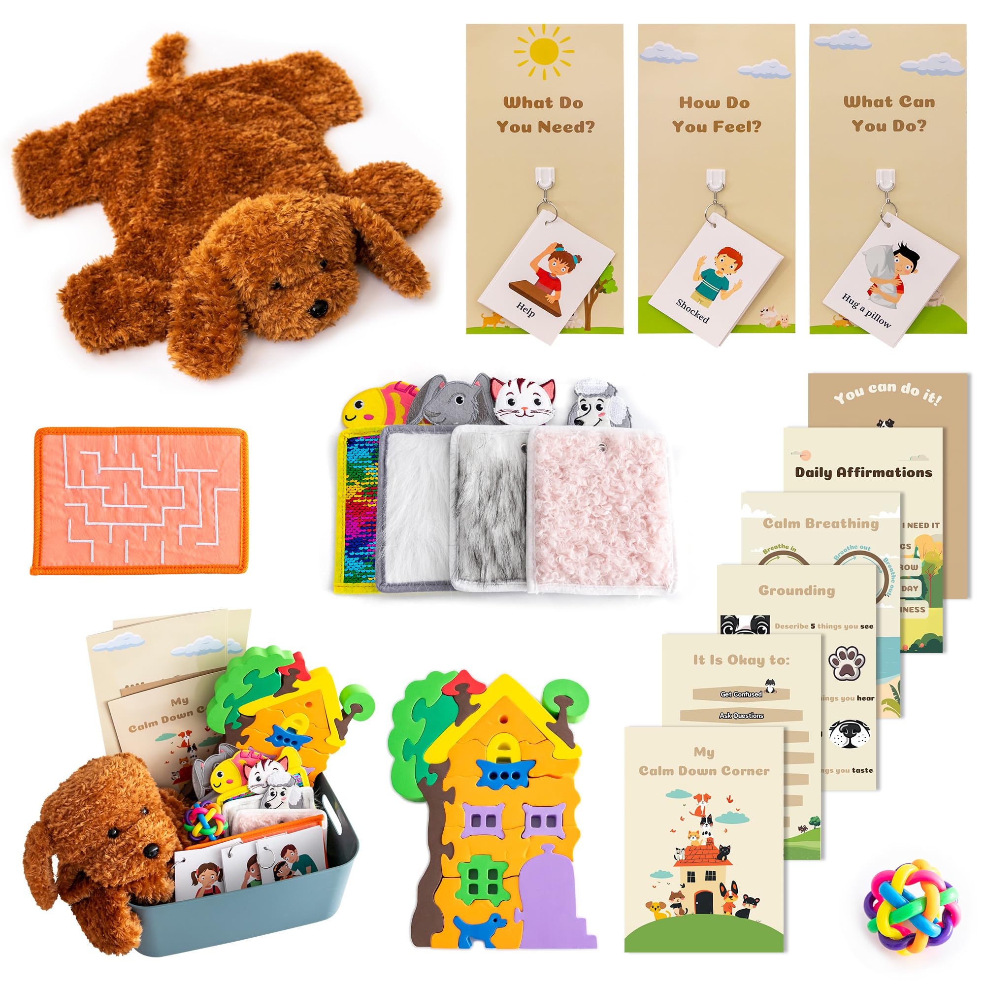 Calm Down Corner | Classroom and Special Education | Pets Themed Sensory Calming Corner Kit withPlush lap animal, sensory mats, Posters, Solutions Wall, Sensory Toys, Fidget Tools for Kids