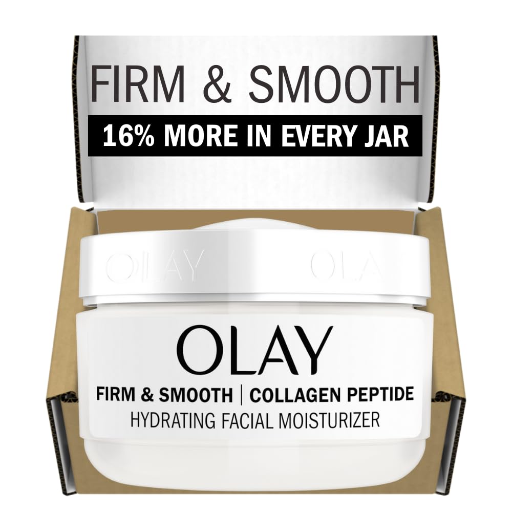 Want visibly firm, plump skin? Get softer, supple skin with Olay Firm & Plump Collagen Peptide Face Moisturizer. This lightweight cream melts into skin with no greasy residue, absorbing quickly for 24 hours of hydration.On day 1, your skin’s texture will look smooth. After two weeks, your skin will look visibly firmer with less noticeable fine lines and wrinkles.This dermatologist-tested face cream is specifically formulated with anti-aging ingredients:Collagen PeptideNiacinamide (Vitamin B3+)The fragrance-free formula supports your skin’s natural renewal process, improving elasticity, reducing wrinkles and aids in surface skin cell regeneration. There are no parabens, phthalates, or synthetic dyes.How to Use:1. Cleanse your skin to remove dirt, oil, or makeup.2. Treat your complexion concerns with skin-specific formulas like brightening serums or smoothing eye creams.3. Moisturize. For daytime, use Olay Firm & Plump Collagen Peptide Face Moisturizer and follow with Olay Retinol Smooth & Renew Night Moisturizer in the evening.It’s the same Olay you love. Now with recyclable packaging. Once you’ve enjoyed every drop, just rinse it out. Then recycle the jar, lid, and shipping container.All product benefit claims were verified by internal studies by Olay in 2018 - 2022. The product formulas are based on decades of research to support the claimed benefits.Launched in August 2023.