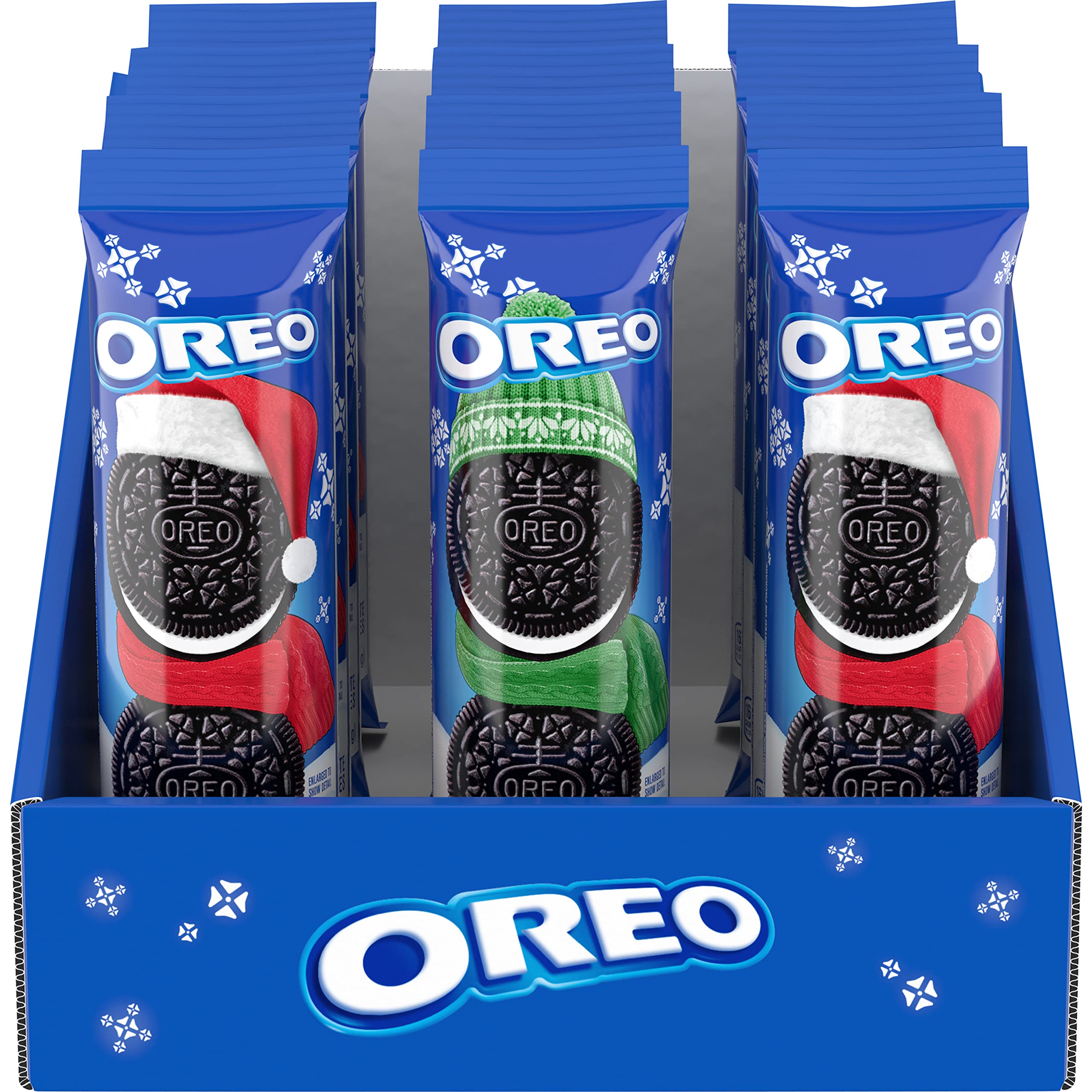 Spread joy this Christmas season with OREO Chocolate Sandwich Cookies. Supremely dunkable, these OREO holiday cookies feature chocolate wafers filled with original OREO creme filling. Packaged in a festive individual gift pack, these chocolate sandwich cookies make great holiday treats, stocking stuffers and holiday party favors. Drop one of these stocking stuffer packs into holiday cookie bags and Christmas stockings or onto your coworkers' desks for delicious, dunkable holiday snacks and gifts. You can even add these Christmas cookies to a holiday cookie tray for your next party or gathering. These bulk cookies are the timeless sweet treats you know and love, making them a must-have item on your list of holiday party supplies and stocking stuffer ideas. Each 4 oz Christmas cookie pack contains 10 OREO cookies and features one of two festive designs to accent your holiday decor.