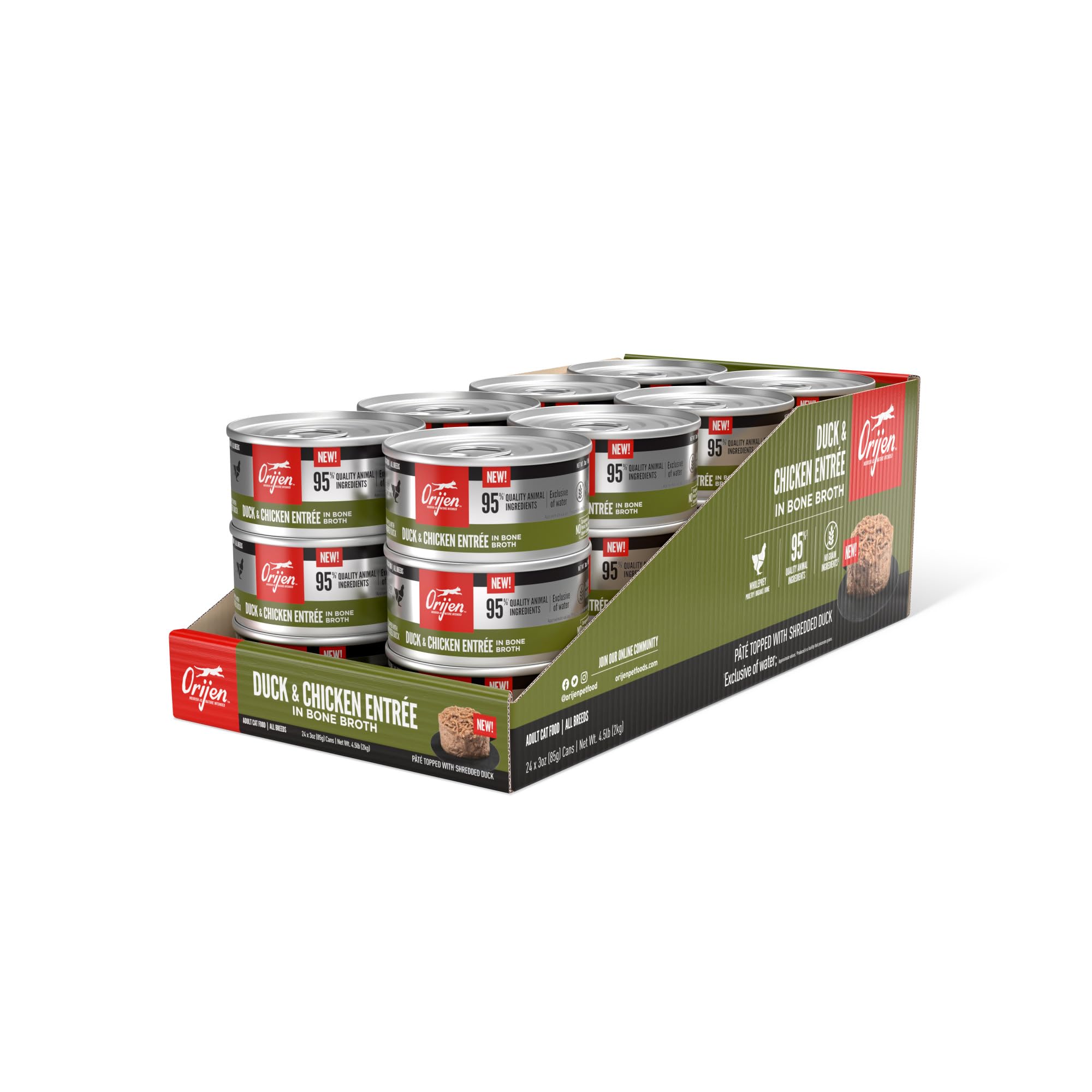 Help your adult cats be their best with the power of ORIJEN Duck and Chicken Entree in Bone Broth Wet Cat Food. This ORIJEN cat food is made specifically to provide the protein, nutrients and minerals your cat needs. It uses WholePrey ingredients, featuring the most succulent and nutrient-rich parts of prey, including poultry, organs and bones, to mimic what your cat's ancestors consumed in the wild. Packed with 95 percent* quality animal ingredients and no peas, lentils, legumes, carrageenan or gums, this high protein cat food pate provides the nourishment your cat needs to thrive. At least the first five ingredients in every ORIJEN cat food recipe are fresh or raw** animal ingredients. The first seven ingredients in this wet cat food are raw duck, chicken, chicken liver, chicken heart, chicken bone broth, duck bone broth and egg. This premium cat food also includes 80 percent moisture to keep your cat nourished and hydrated. NOURISH AS NATURE INTENDED. *Exclusive of water; Approximate and derived from the unprocessed state of the ingredients **Our fresh ingredients use refrigeration as the sole method of preservation and our raw ingredients are frozen at their peak freshness