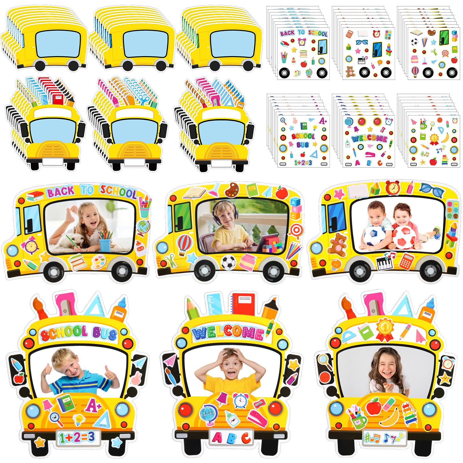 Pajean 48 Sets School Bus DIY Crafts Kit Yellow School Bus Picture Frames Back to School Stickers School Bus Birthday Photo Frames Decor for Student First Day of School Party Decor Supplies