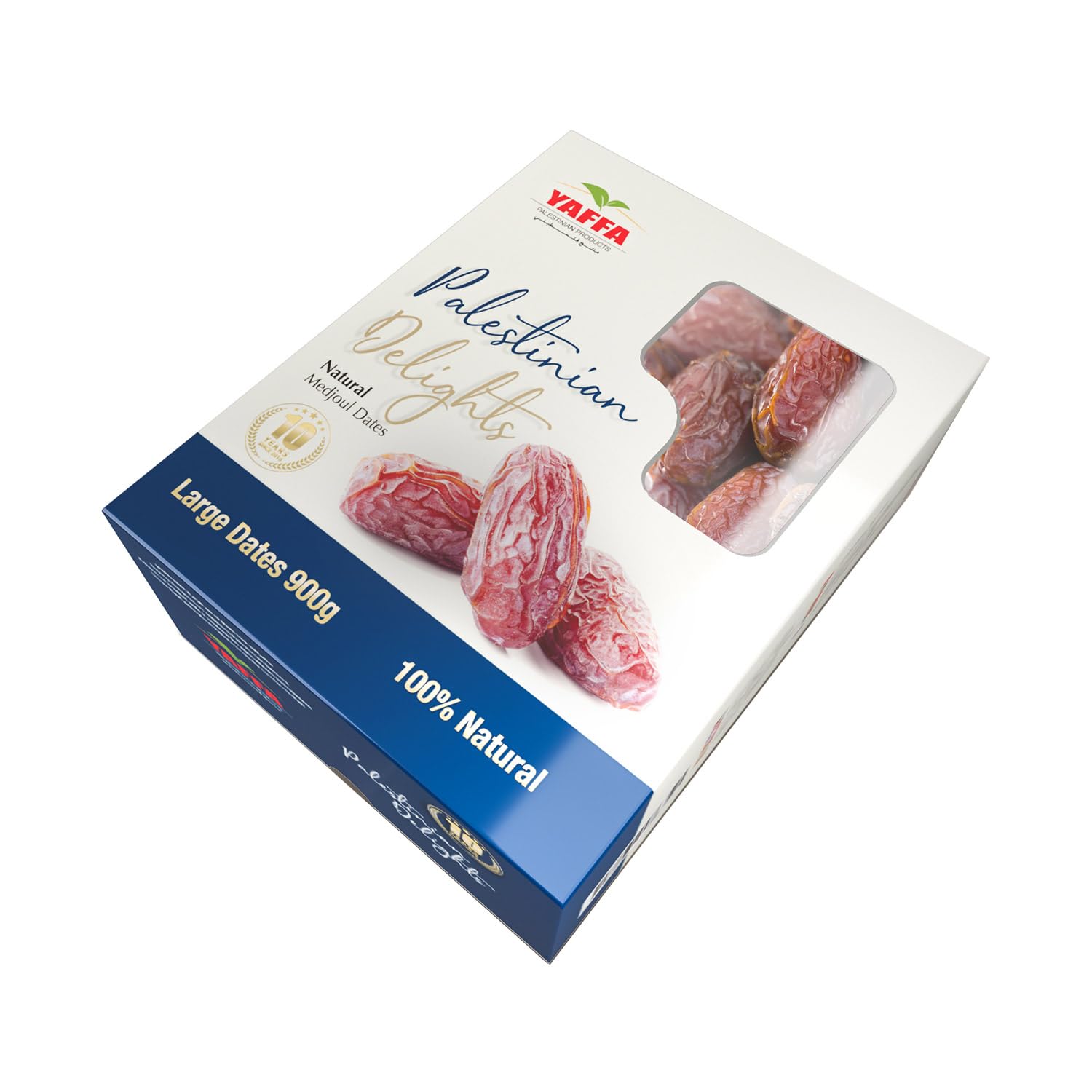 Box of Grade 2 Large size Medjoul Dates harvested near the historical Palestinian town of Jericho. These are fresh dates of high quality carefully stored under a controlled cooled environment. These have been cultivated on Palestinian land by Palestinian farmers and workers. Please note this box is now Green in color.