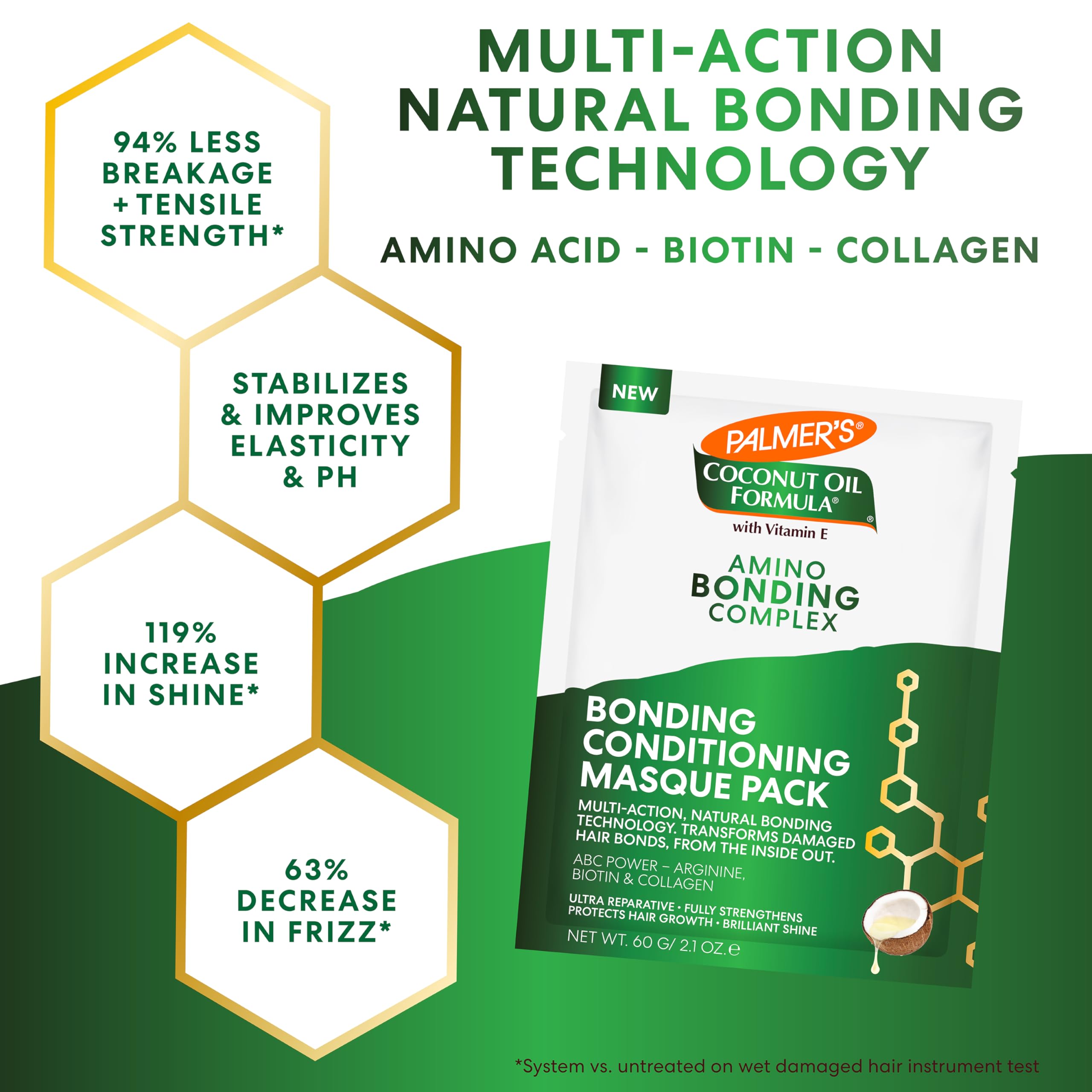 Palmer's Hair Mask, Amino Bonding Complex Intense Conditioning Masque Pack with Coconut Oil & Vitamin E, Hydrating, Heat Protectant, Anti Frizz, Adds Shine, Protects Hair Growth, All Hair Types This highly concentrated masque is uniquely formulated with nourishing ingredients, including Coconut oil, Vitamin E and essential nutrients to deeply nourish, enhance moisture, and seal in hydration. Powered with Amino Acid (Arginine), Biotin & Collagen, the bonding hair mask maximizes tensile strength, provides lasting protection, adds brilliant shine and softness. Our heat protectant hair treatment masks shield your hair from styling damage, providing an additional layer of heat protection up to 450 degrees. This ultra-reparative hair mask helps control frizz, breakage and split ends. Whether you have curly, straight, or fine hair, this hair bonding treatment promotes growth and thickness, making it a great addition to your hair care routine. How It Works This bonding complex penetrates to the hair’s cortex, helping to support the keratin structure and reinforce damaged hair bonds. With each use, hair becomes stronger, shinier, softer, and bouncier, while minimizing further damage. Suggested Use After shampooing, coat hair from root to tip. Massage or comb through, wait 5-10 minutes, then rinse.
