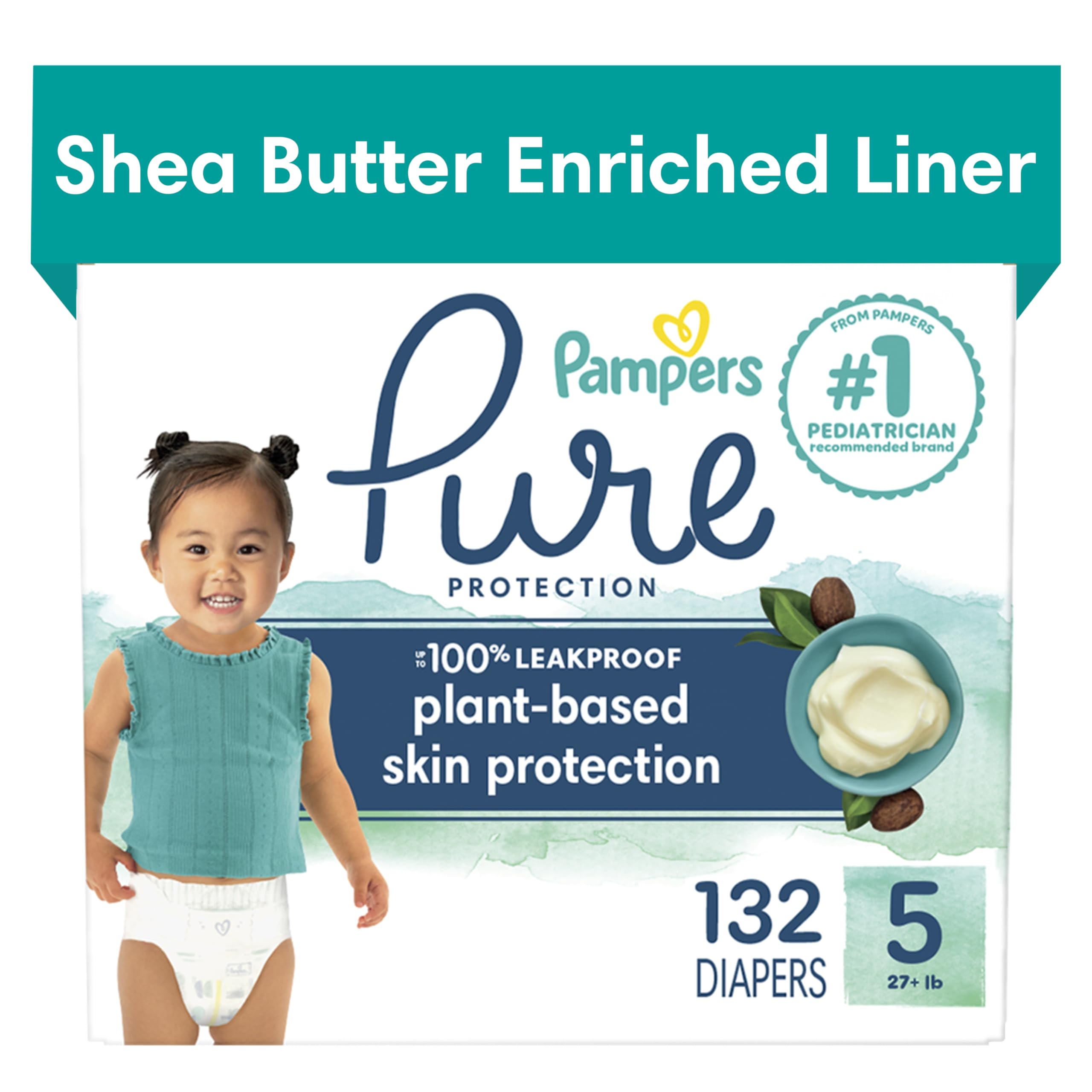 Pure protection. Plant-based. 100% leakproof. The search is over-everything you’ve been waiting for in a diaper, you’ll find with Pampers Pure. Pampers Pure are premium diapers carefully crafted with plant-based ingredients and a shea butter infused liner to help protect baby’s sensitive skin. Pampers Pure diapers are hypoallergenic, fragrance-free, paraben-free, latex**-free, and elemental chlorine-free. Featuring improved softness and an absorbent Lockaway Core that stays 2X drier† for healthy skin, Pampers Pure diapers are uniquely made to give your baby the utmost care and protection. Our luxury diapers are approved by dermatologists and the Skin Health Alliance. Plus, our designer prints make Pampers Pure just as precious as the babies they are protecting. Discover trusted skin protection from the #1 pediatrician recommended brand, Pampers. All Pampers diapers are assembled in the U.S.A. from domestic and imported materials with zero waste to landfill‡ in our factories. *Liner enriched with plant-based, skin-soothing ingredients. **Natural rubber. †Vs. Honest diapers. ‡ Baby Care-Global.