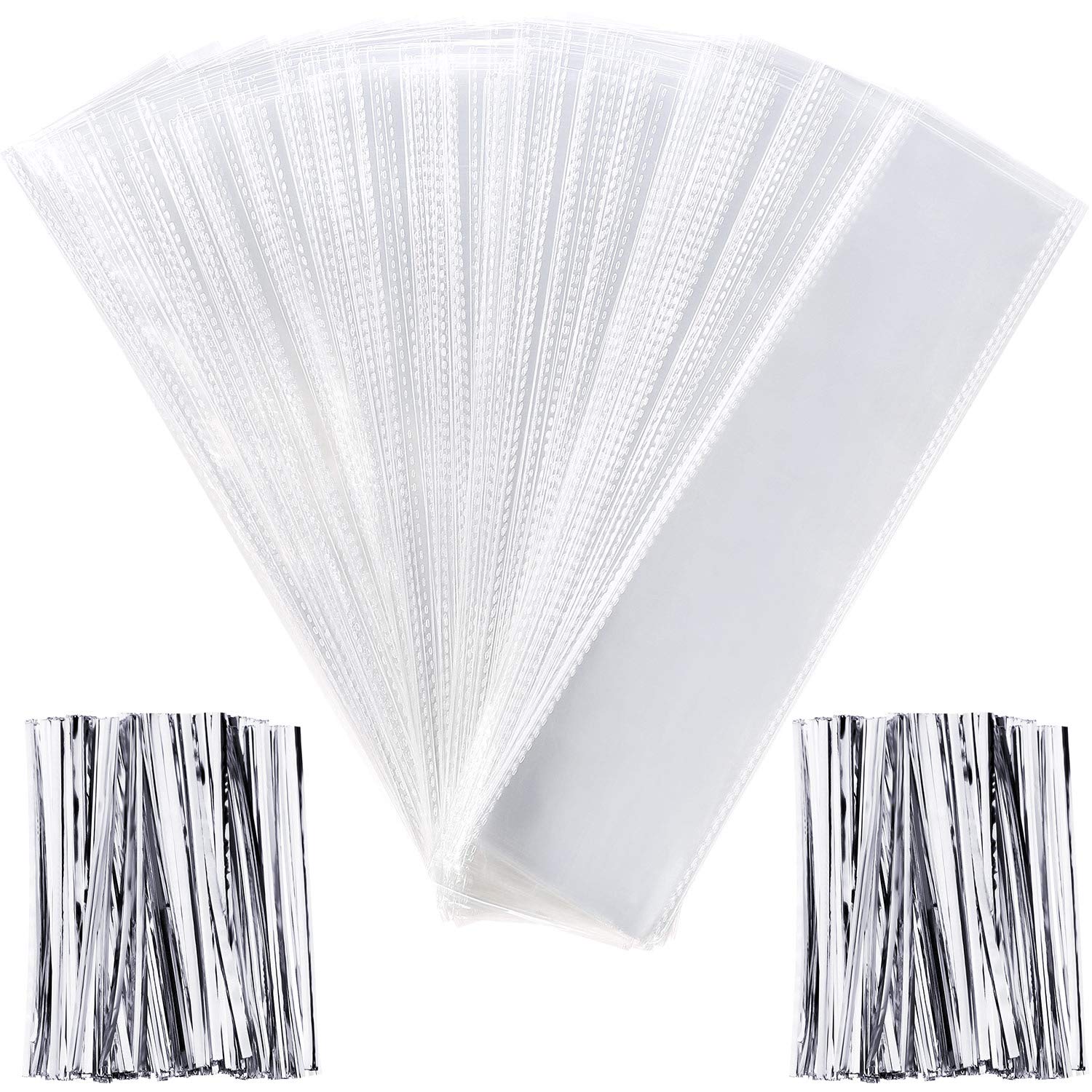 Pangda 200 Pieces Clear/Transparent Cello Bags Rectangle Plastic Treat Bags for Chocolate Candies Pretzel Cookies with 200 Pieces Twist Ties (Silver Ties)