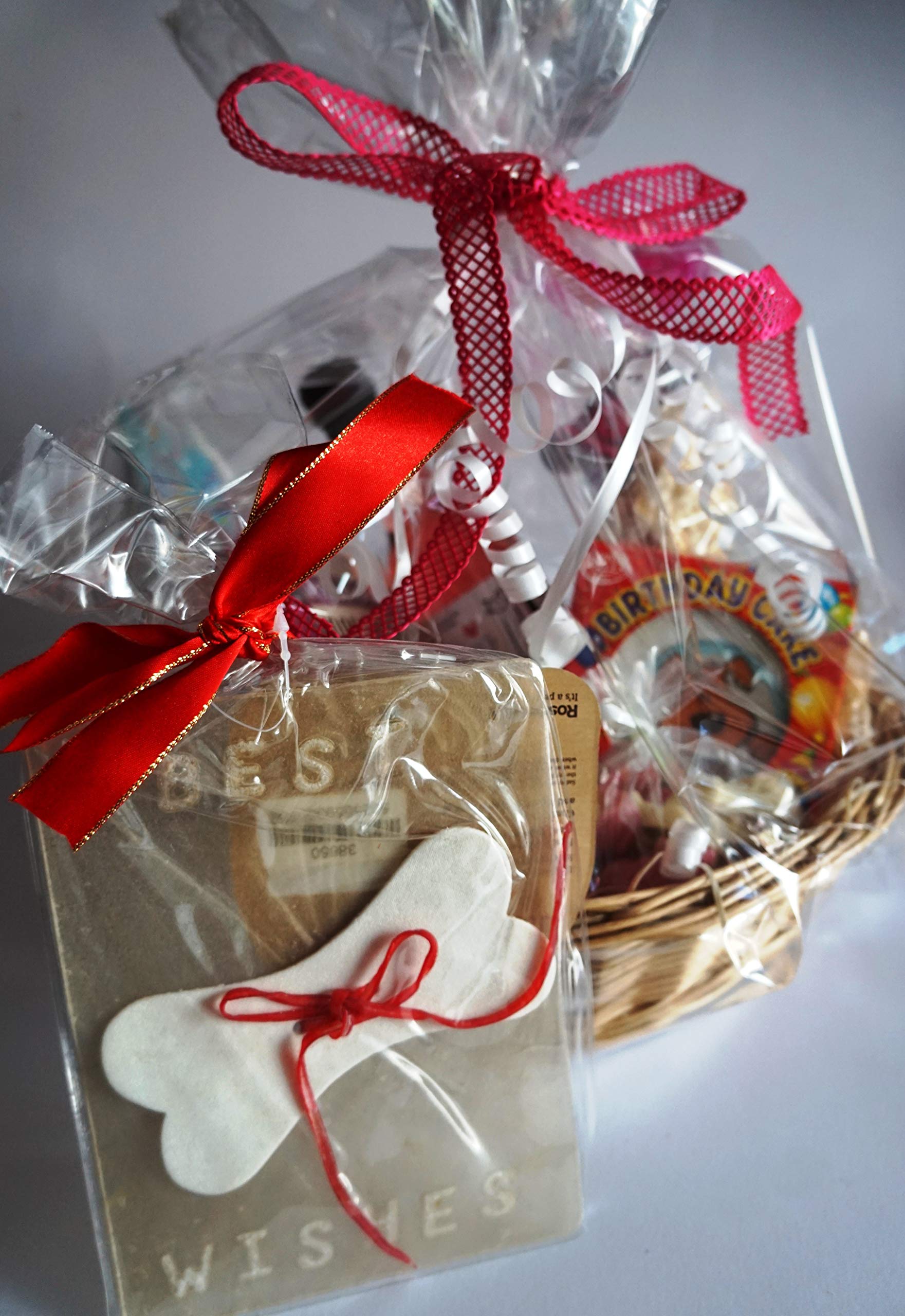 THIS DELIGHTFUL DOGGY CELEBRATION/BIRTHDAY BASKET IS THE PERFECT WAY TO TREAT YOUR PRECIOUS POOCH. THE ADORABLE WICKER BASKET COMES GIFT WRAPPED AND FILLED WITH DELICIOUS GOODIES GUARANTEED TO GET YOUR DOGS TAIL WAGGING WITH GLEE. THIS BASKET COMPRISES THE FOLLOWING LIP SMACKING SELECTION OF TASTY TREATS: A SELECTION OF DELICIOUS DOG SAFE CHOCOLATE TREATS COMPRISING - HUNDRED AND THOUSANDS DOGGY BUTTONS IN WHITE, MILK AND STRAWBERRY CHOCOLATE. CHOC FISH AND CHIPS, CHOC SUGAR MICE & A DOG SAFE CHOC BAR. THE BASKET ALSO CONTAINS A BAG OF DELICIOUS DOGGY POPCORN A CHEWY BIRTHDAY CAKE AND NON ALCOHOLIC DOG PAWSECCO WINE. WE WILL ALSO INCLUDE AN EDIBLE RAWHIDE GREETINGS CARD