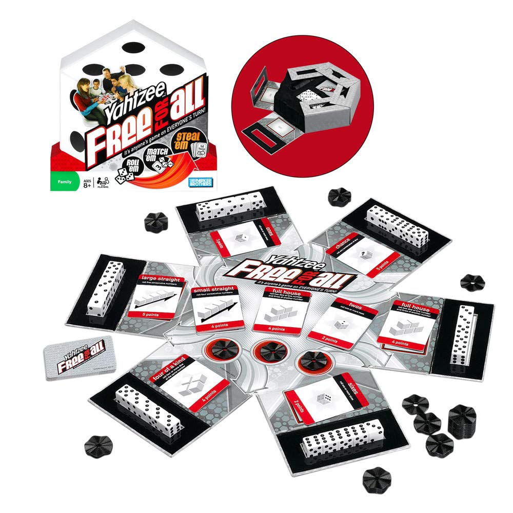 From the ManufacturerWith Yahtzee Free For All it's anyone's game on everyone's turn! Roll. Match. Take. Steal.Score. Win! There's so much going on when you play Yahtzee Free For All, you're part of the action even when it's not your turn. Roll the dice to match cards with classic Yahtzee combinations. If you match one, take it--but now it's "up for grabs" until your next turn, so anybody can steal it by matching or beating your dice roll! It's edge-of-your-seat fun 'til the very last card is safe!
