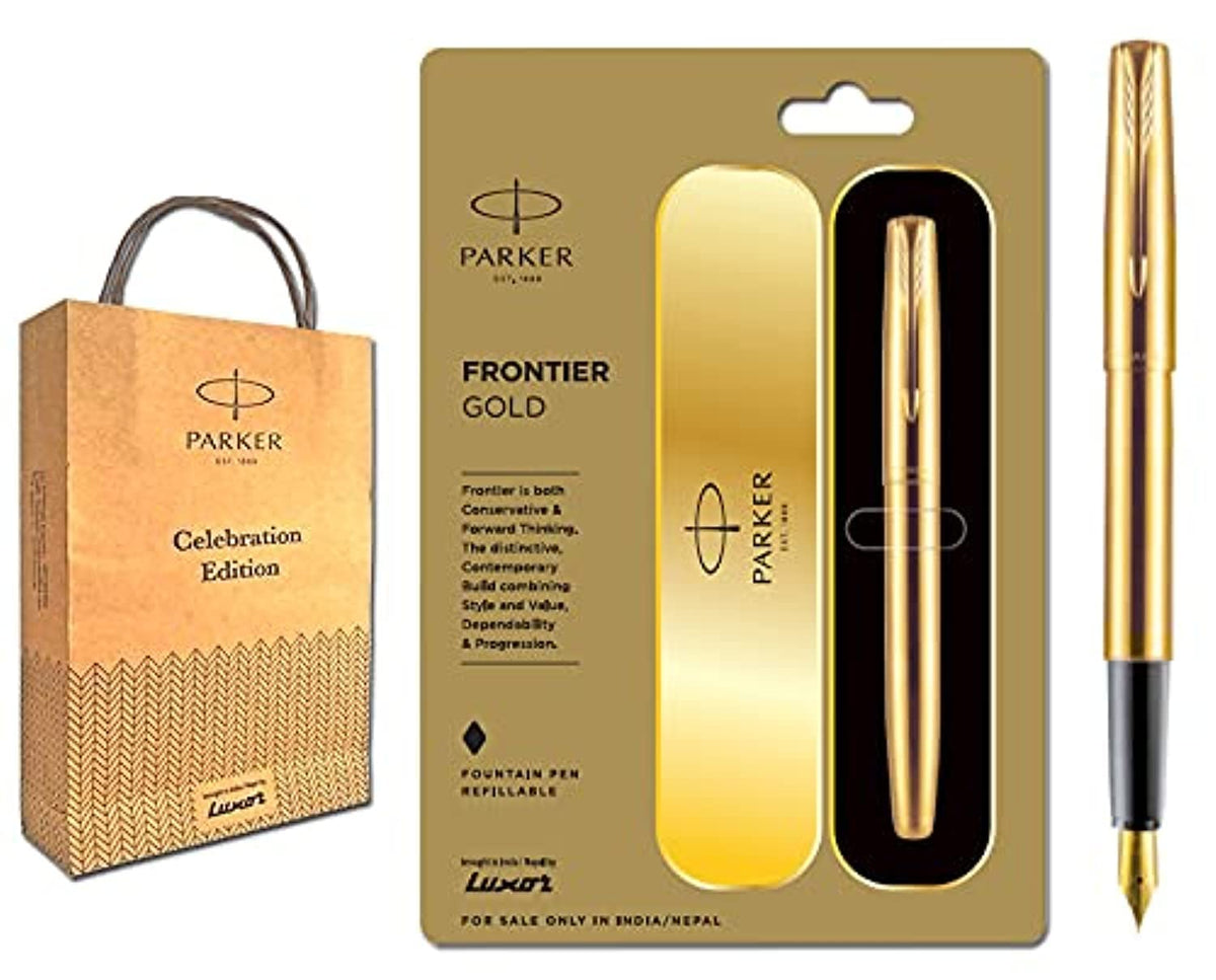 Parker Frontier Gold Fountain Pen.Its matte epoxy resin coated stainless steel body and a matching gold-plated clip to adorn its cap.the pen is created to stand out in the crowd.Parker Frontier Gold Fountain Pen