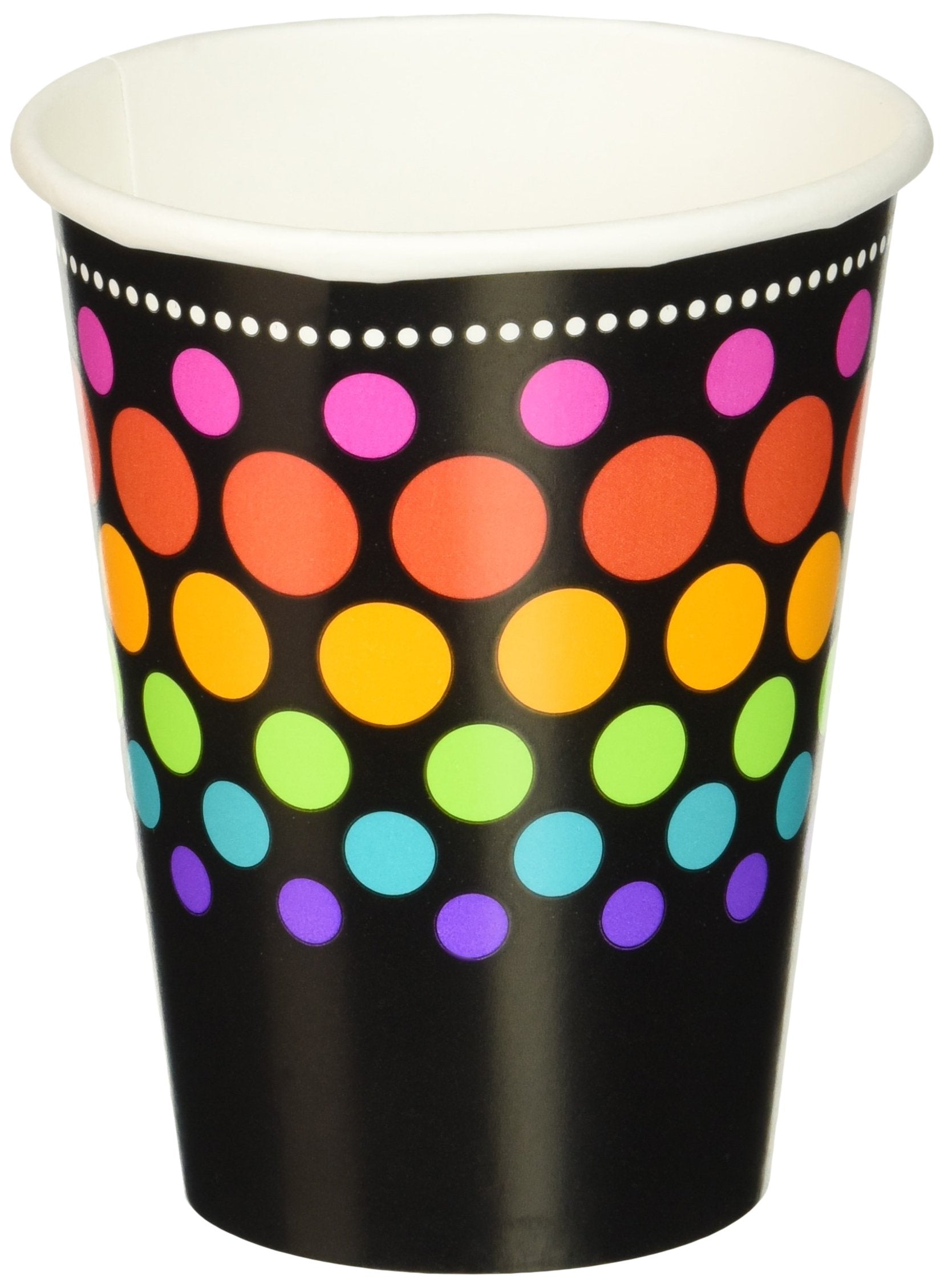Whether you're thirsty or there for the booze, these ultra chic black candy colored polka dotted paper cups are the perfect partner for every beverage at any party!; Black paper cup adorned with polka dots in 6 candy rainbow colors with a white dotted bottom border. It's simple modern and chic design can be used for ANY occasion.