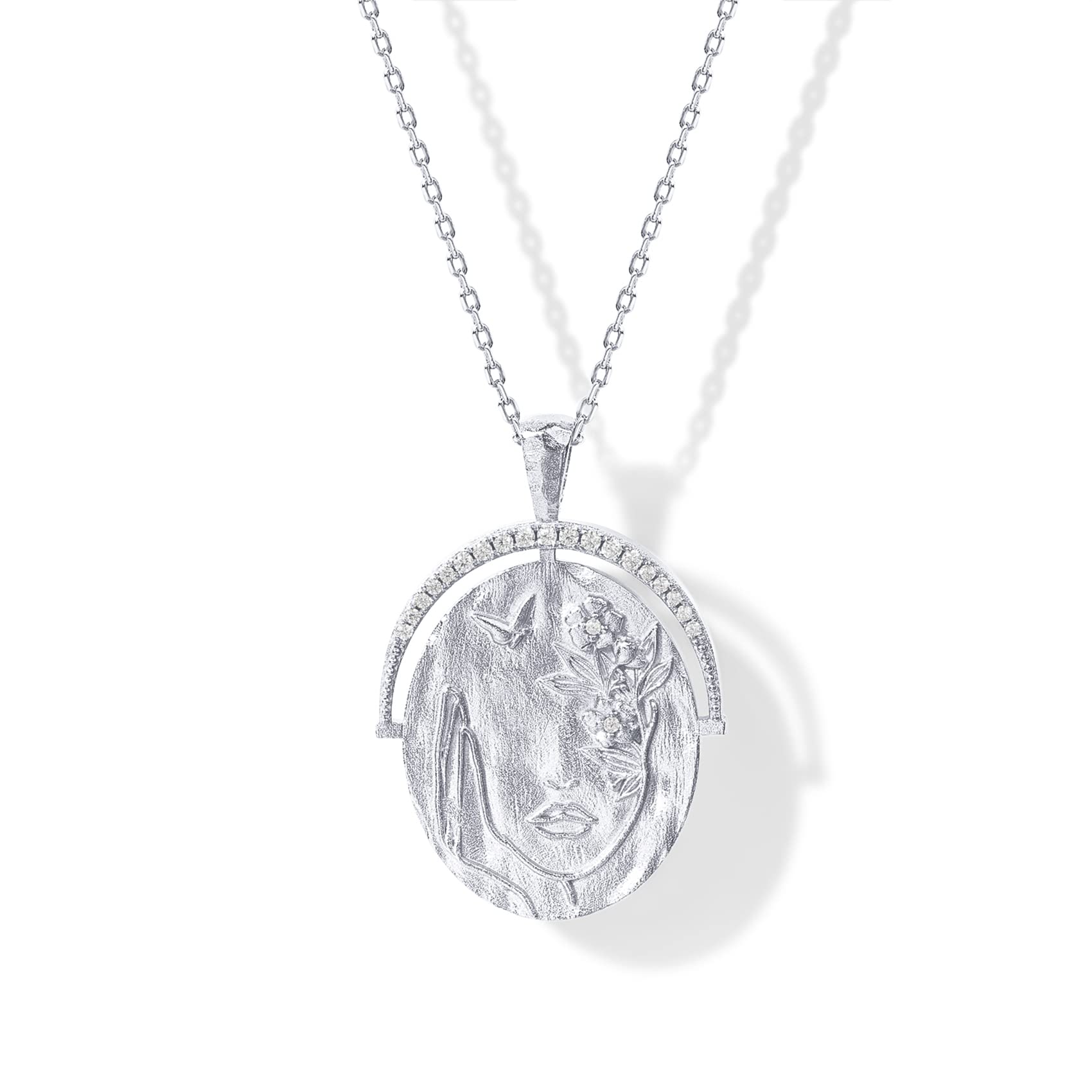 PAVOI 14K Gold Plated Engraved Oval Coin Pendant Necklace for Women | Bohemian Necklace (White Gold)