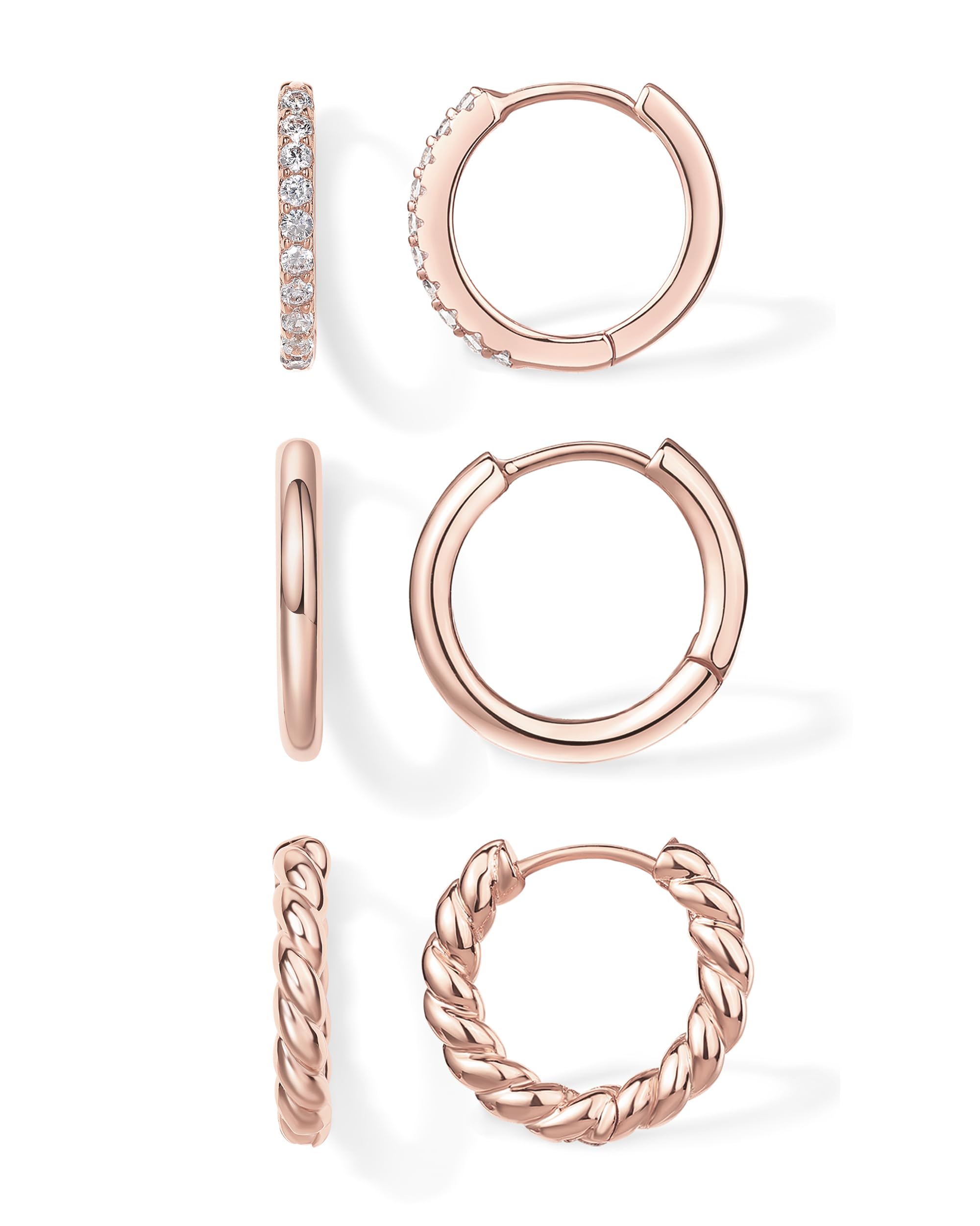 PAVOI 18K Rose Gold Plated 925 Sterling Silver Posts 3 Pairs Small Hoop Earrings Set | Cubic Zirconia Plain Rope Huggie Hoops for Women | Lightweight Earrings Pack