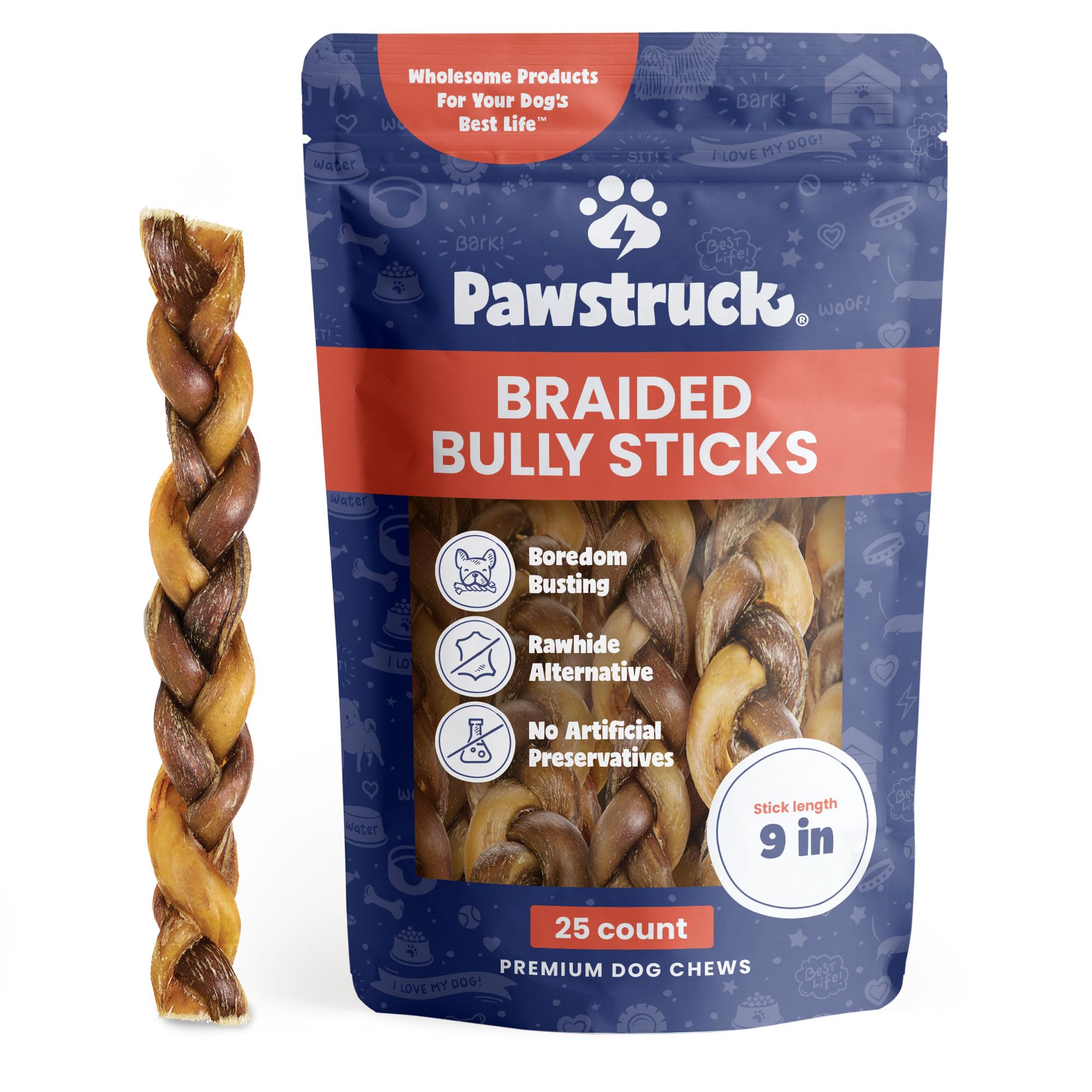 Pawstruck Natural 9” Braided Bully Sticks for Dogs - Tough Long Lasting, Rawhide Free, Low Odor, Healthy Single Ingredient Chew Treat for Aggressive Chewers - 25 Count - Packaging May Vary