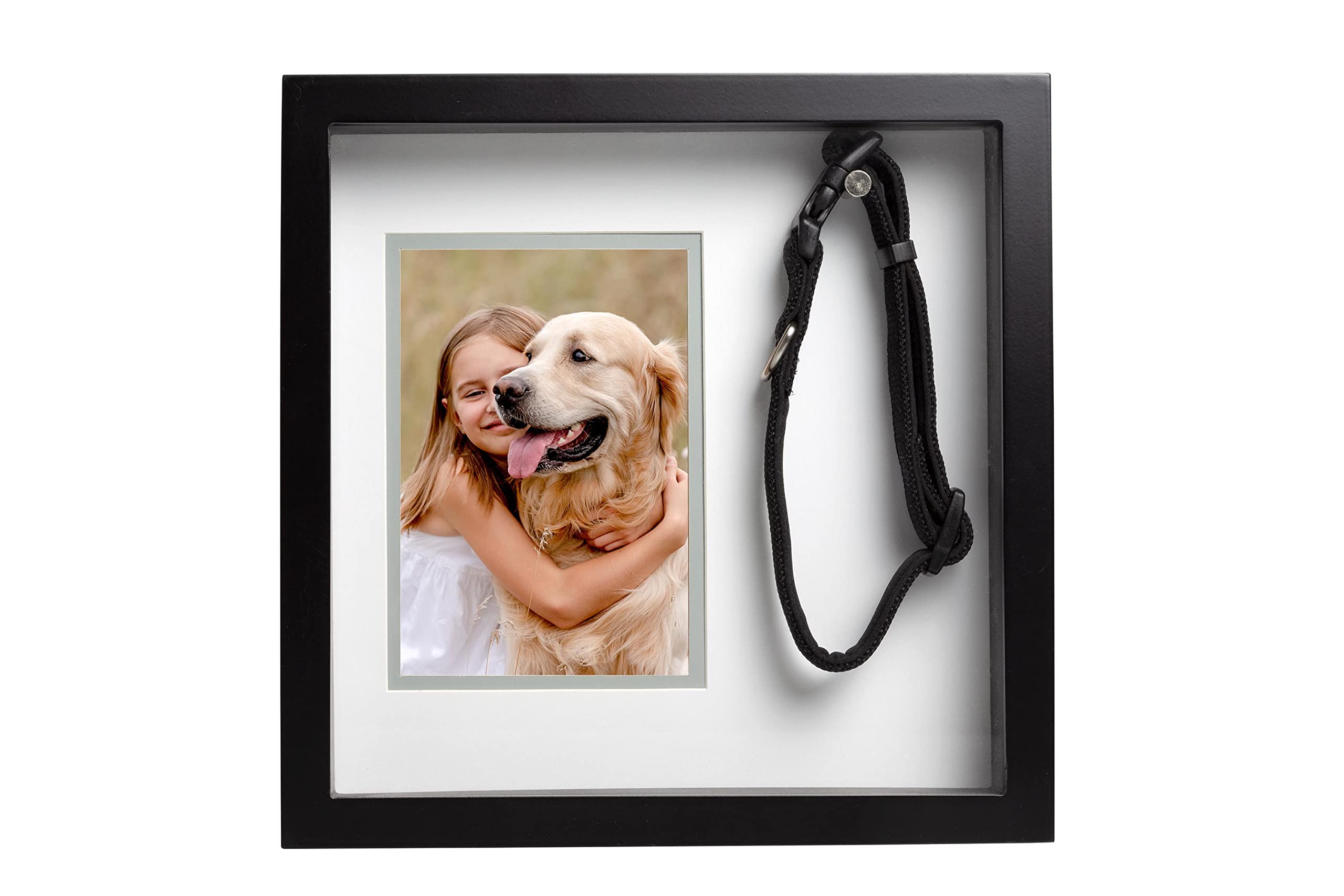Pet lovers can’t get enough of their furry friends and adding to the home decor with pets in mind is par for the course. The Pearhead Pet Collar Frame completes your home’s look in purr-fect style, showing off an adorable picture of your beloved fur baby right next to one of their favorite collars. Display your pet’s collar using the chic metal display hanger, sturdy enough to hold even the weightiest collars, with plenty of room for all their tags and other accessories. The dark stained wood exterior effortlessly blends in with your home’s aesthetic, while the smoothly beveled silver and white mat detail gives your space clean and crisp lines. This frame is also ideal for those who have sadly had to say goodbye to their family friend and can be a fantastic way to give remembrance to them. You can create a pet memorial space dedicated to their loving honor with this beautiful frame as the centerpiece, with their favorite collar and the sweetest pet picture around to look at and remember all the wonderful times you had together. Pet owners love this gift and can’t wait to show off their best friend. DIMENSIONS - Frame: 10.75”W x 10.75”H x 1.9”D; Collar Hanging Pin: 1.25”; Display Depth: 1.25”; Photo Insert: 4.5”W x 6.5”H