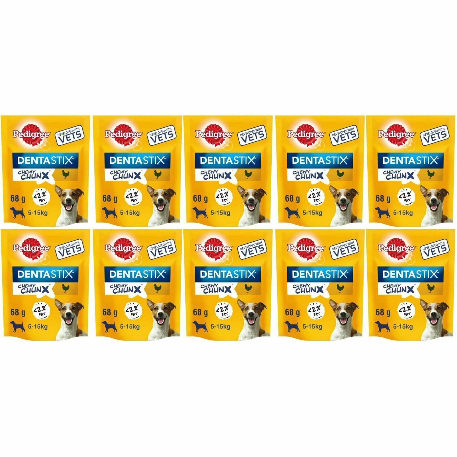 Product InformationDogs love to explore through their mouths, so its important to take care of their teeth by using specially made dog chews. Pedigree Dentastix Chewy ChunX treats are our specially designed dog chew sticks. With active ingredients, scientifically proven to clean with every bite, these chicken dog treats come in mini size for 5-15kg dogs.Pedigree Dentastix Chewy ChunX dog chews have been developed with vets and are scientifically proven to clean with every bite of these dental treats.Delicious chicken dog treats that contain less than 2% fat per 100g.These tasty Dentastix dog dental sticks are suitable for dogs from 5-15kg.Pedigree Dentastix Chewy ChunX are tasty dog treats with no added sugar, helping keep your canine companion's teeth clean and healthy.Each bite of Dentastix Chewy ChunX dog chew sticks contains no artificial colours or flavours.Dual Clean: These Dentastix mini size dog dental sticks clean teeth and support gum health, providing your canine with a tasty chicken dog treat at the same time.Preparation and UsageFeeding instructions: Small dogs (5-9 kg), feed 3 treats per day. Small-Medium dogs (9-13 kg), feed 4 treats per day. Medium dogs (13-15 kg), feed 5 treats per day. This is a chewy treat that is only suitable for dogs between 5 kg and 15 kg. It is not suitable for dogs under 5 kg or for dogs over 15 kg. As with any edible product, monitor your dog to ensure the product is chewed adequately. Swallowing any item whole can be harmful or even fatal to a dog. Please reduce main meal accordingly.Fresh drinking water should always be available.Nutritional ValuesTypical valuesAnalytical constituents (%):Protein: 7.0, Fat content: 1.8, Inorganic matter: 6.1, Crude fibre: 0.60, Moisture: 18.0, Energy: 314 kcal/100 g, Vitamin E: 1297 mg, Zinc (Zinc sulphate, heptahydrate): 190 mg, Chicken flavour: 43.8 mg