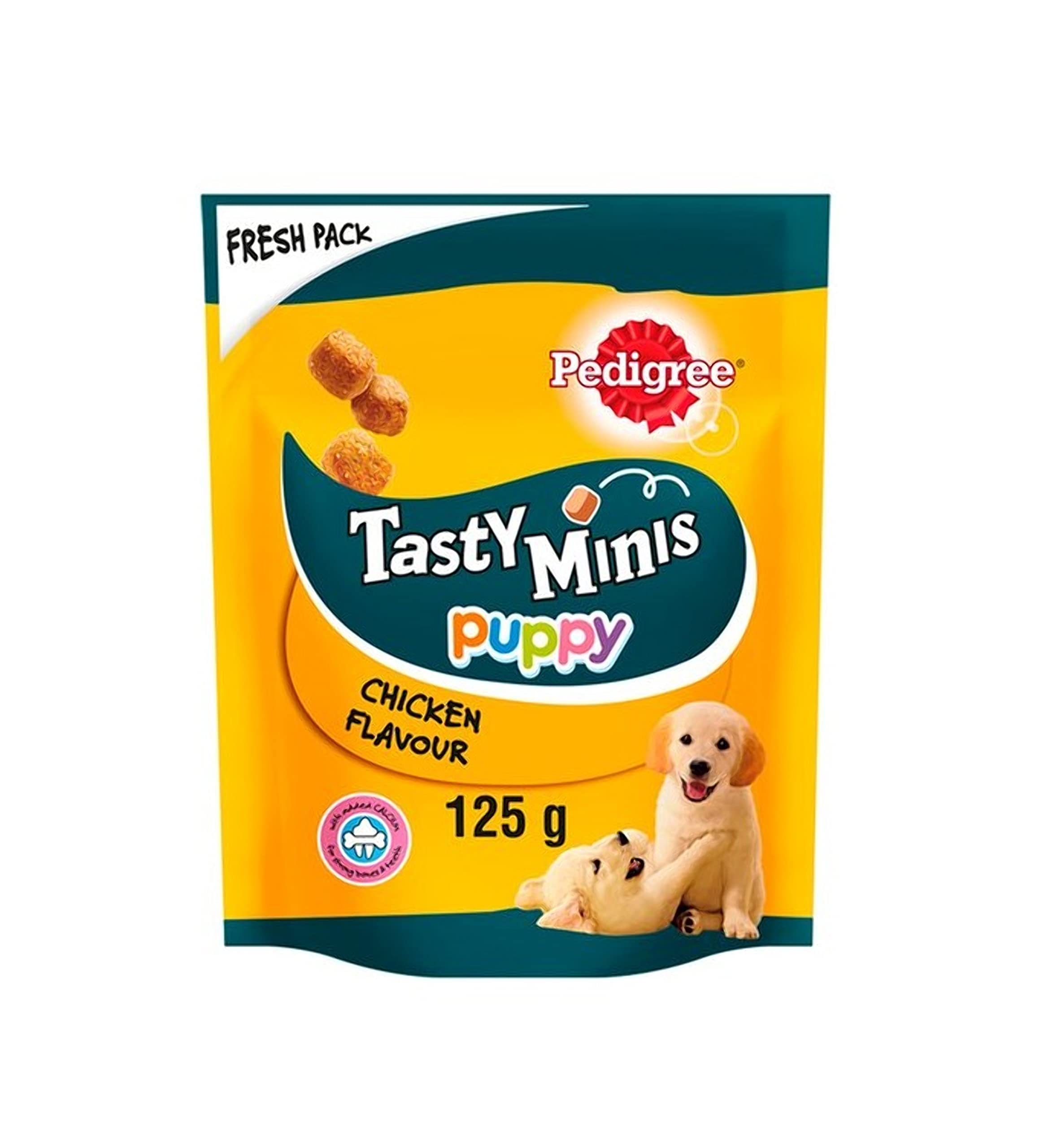 Pedigree Tasty Minis Puppy are bite-sized treats with a delicious chewy centre, that have been specially designed to be kinder to smaller, developing teeth than ordinary biscuits. Enriched with calcium to help give strong teeth and bones, vitamins and minerals to help maintain natural defences and Omega 3 to help keep your puppy fit for life, Tasty Minis are the perfect treat for your puppy.
