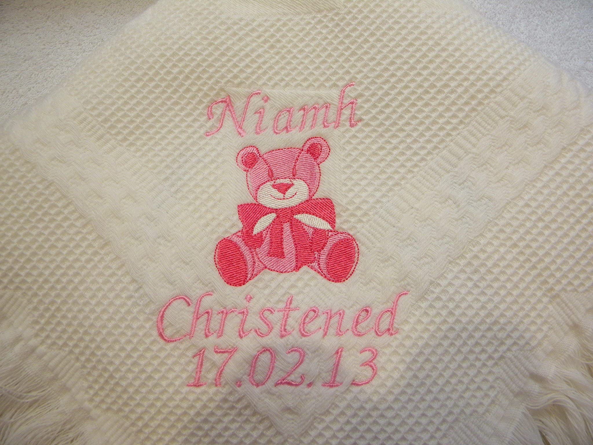 Personalised EMBROIDERED Shawl with the teddy design and a name and date of your choice (or just a name). - These shawls make a beautiful keepsake. | Our shawls are LARGE in size measuring approx 120 cm x 120 cm and are available in either pink, blue, white or cream with a fringed edge. The embroidery will be done in the corner of the shawl the name will be arched over the teddy bear and the date(if required) will be below the teddy bear. They can be embroidered in most colours so if ordering a white or cream shawl please leave the colour required for the embroidery | TO PERSONALISE Please choose one of the following (1) select GIFT MESSAGE at the checkout and leave your embroidery details in the gift message box. (2.) Call or text us on 07973 725717. (3) Send the SELLER a message through AMAZON. Whichever option you choose please leave the name, date, whether it is a baptism or christening and the colour you require the embroidery in. If you don’t manage to leave your embroidery details - we will contact you by phone or email. | Shawls will be dispatched within a maximum of 5 working days and will be posted 1st class in the UK or air mail if outside the UK