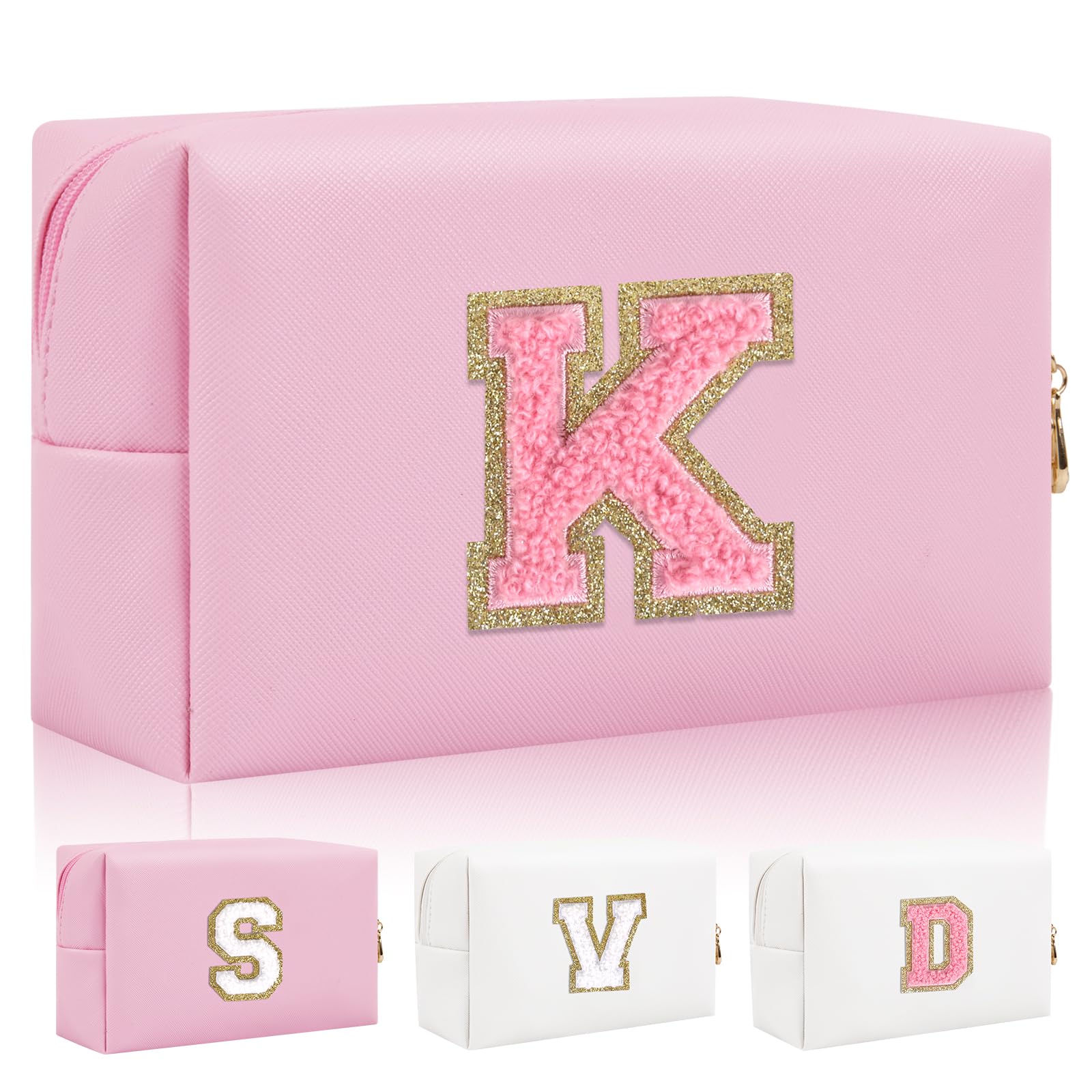 Personalized Initial Letter Patch Makeup Bag, Preppy Small Chenille Letter Cosmetic Bag with Zipper, PU Leather Waterproof Travel Toiletry Bag Monogram Make Up Pouch for Women Girls(Letter K)