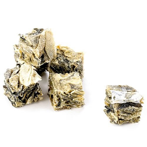 Dogs love these tasty, delicious treats! Made from 100% fish skins these natural healthy treats have a rough texture which helps remove tartar from your dog’s teeth. Omega 3 and other fish oils to help promote a healthy coat and supple joints. Omega oils have been shown to improve concentration and temperament. Fish4Dogs Sea Jerky Tiddlers are: - Entirely natural - no additives, preservatives or colourings - Gluten free - Hypo-allergenic Size Sea Jerky Tiddlers are around 15mm cube. See photos above for a size-guide. Suitability Ideal for small dogs as a treat, such as Yorkshire Terrier, Dachshund, Poodle, Shih Tzu, Chihuahua, Pomeranian, Pug, Terrier. Sutable for larger dogs as a training treat. Ingredients Cod Skins 100% (nothing else!) Nutritional Analysis Protein 85% , Ash 12%, Oil 2.6%, Moisture 8%, Fibre 0.6%, Omega 3 0.35% Calorific Value 6.62 Kcal/10gm Feeding Instructions Feed up to 12 treats a day depending on the size of your dog
