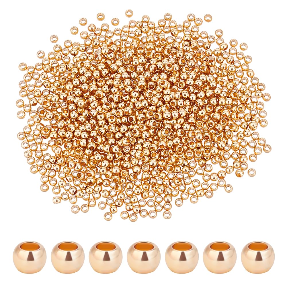 PH PandaHall 1000pcs 2mm 14K Gold Plated Brass Beads Long-Lasting Round Smooth Spacer Beads Seamless Loose Ball Beads Gold Metal Beads for Summer Hawaii Necklaces, Bracelets, Earring Making