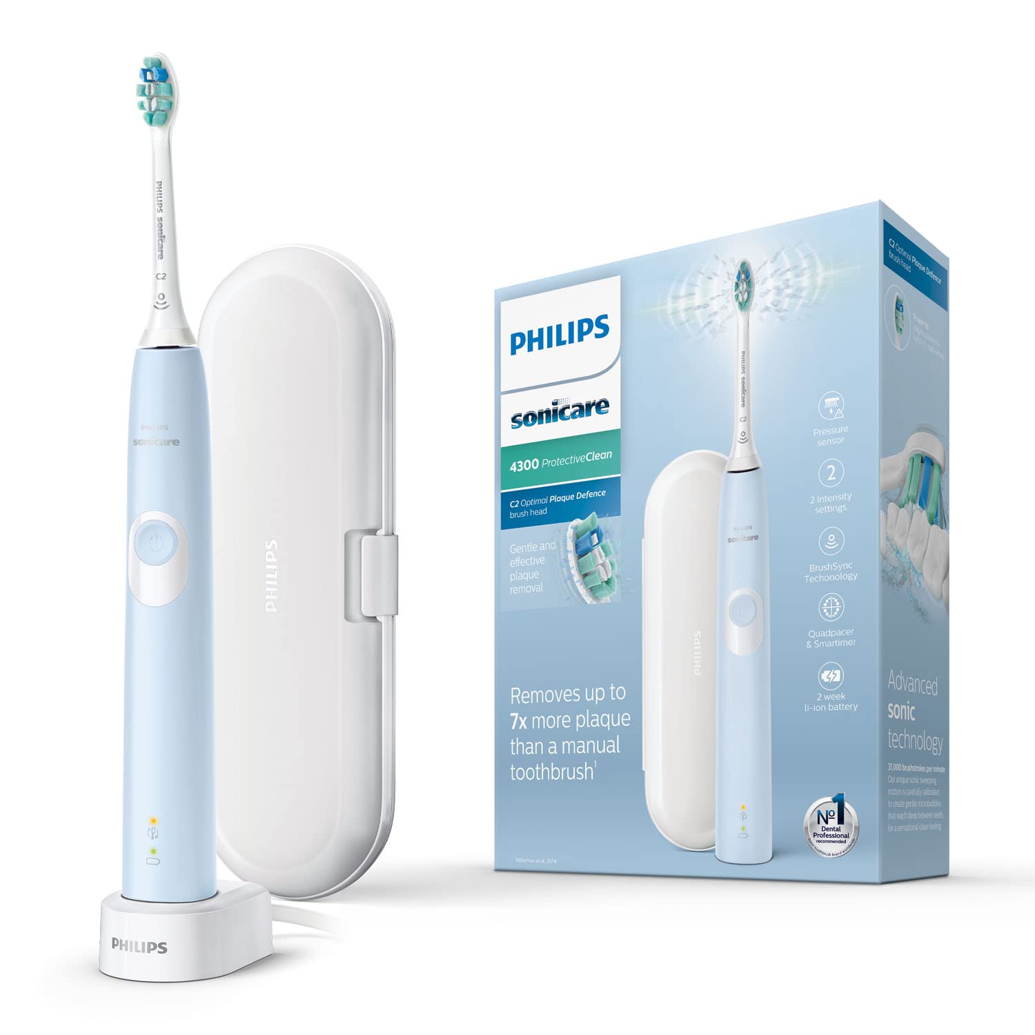 DescriptionProduct DescriptionPhilips Sonicare Protective Clean gently removes up to 7 x more plaque than a manual toothbrush. The built in pressure sensor will let you know if you are brushing too hard and the smart brush head replacement reminder alerts you when to replace your brush head for effective cleaning, every time. The travel case makes it easy for you to take your electric toothbrush with you wherever you go.Directions1. Remove the toothbrush from its packaging. 2. Fully charge the toothbrush before using it for the first time. 3. Wet the toothbrush head and apply toothpaste. 4. Place the toothbrush in your mouth. 5. Press the power button to start brushing. 6. Gently move the toothbrush across your teeth and gums. 7. The toothbrush will alert you if you're brushing too hard. 8. Brush for two minutes, with the brush automatically pausing every 30 seconds to indicate when to move to the next quadrant of your mouth. 9. After brushing, rinse the toothbrush head thoroughly. 10. The toothbrush has a smart brush head replacement reminder that will alert you when it's time to replace the brush head.Box ContainsHandles: 1 ProtectiveClean. Brush heads: 1 C2 Optimal Plaque Defence. Travel case: 1. Charger: 1. User manual. Guarantee.