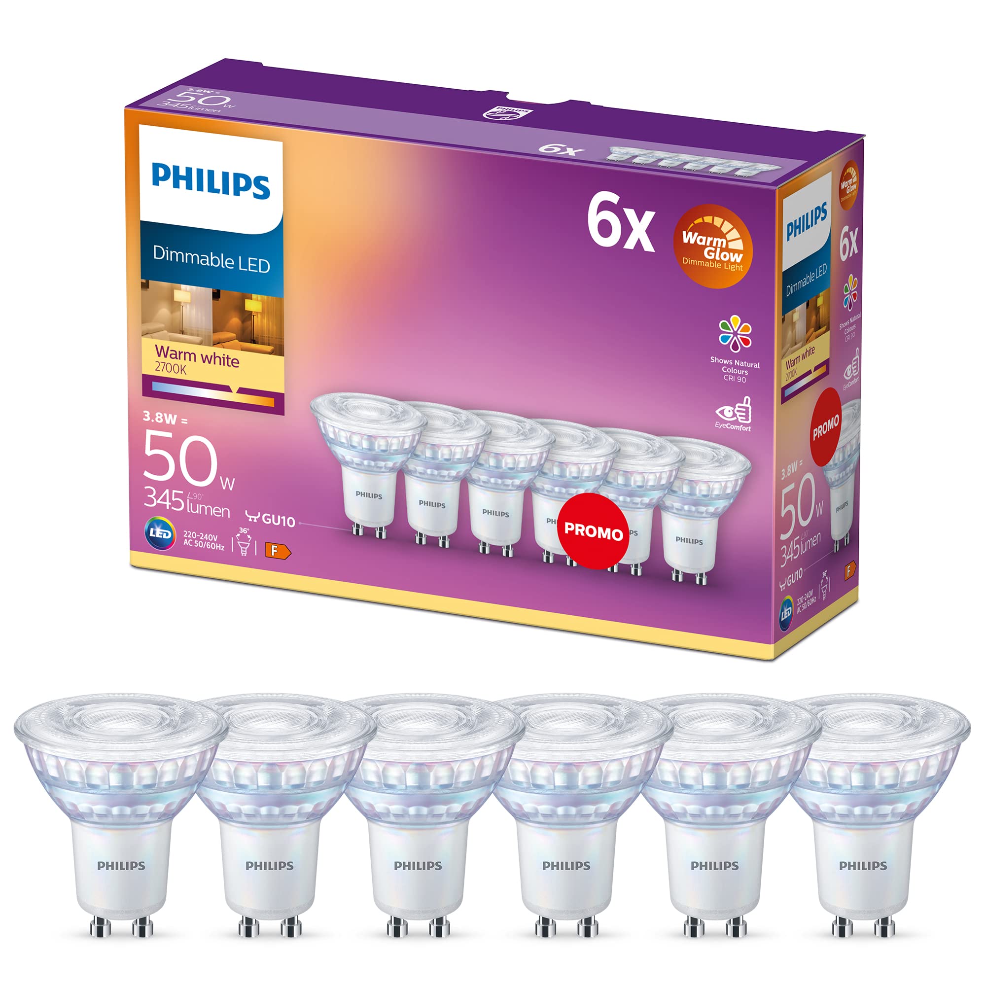 Product DescriptionPhilips LED spots with warm glow dimming offer a new experience for dimmable LEDs. As these Philips spots can be dimmed to the warm tones of traditional bulbs, you can go from everyday functional lighting to inviting to cosy atmospheres.Box Contains6 X Philips LED Classic Warm Glow Dimmable 3.8 W (50W) GU10 Glass LED Spot Light - Warm White