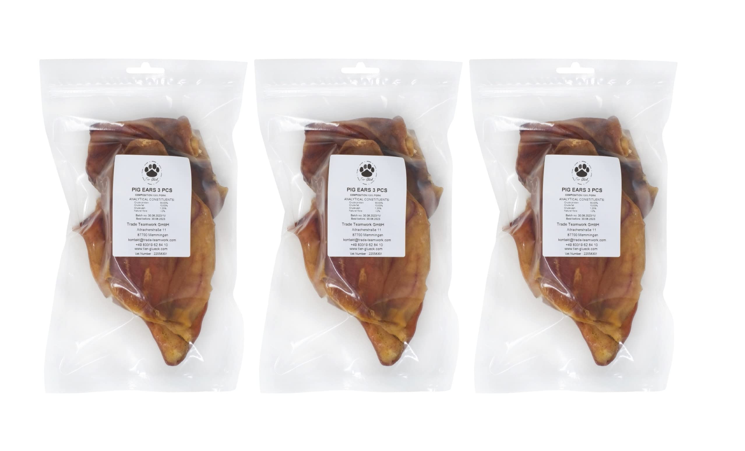 Our pig ears are a pure natural product - without preservatives, dyes and flavour enhancers. Ideal as a chew treat or as a treat in between. Thanks to the cartilage fabric, long-lasting chewing fun is guaranteed for every four-legged friend. In addition, the natural chewing instinct is satisfied and all teeth are cleaned. As our pig ears are a natural product, they may vary in size, shape and colour. Average size: approx. 14cm - 17cm ---------- Composition: 100% Pig Analytical Constituents: Crude protein: 66.63%, Crude Fat: 13.63%, Crude ash: 1.55%, Natural fibre: <2% Please store goods dark, cool and dry. Fresh drinking water should always be ready. MHD: at least 12 months after purchase