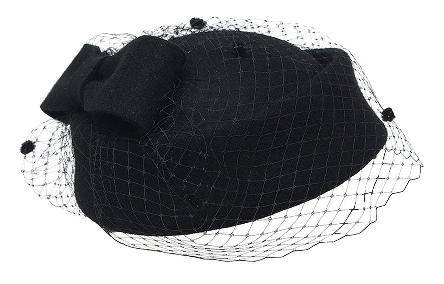 Pillbox Hat Fascinator Beret Wedding Party Top Hat Church Wool Hat for Women, Black, One Size
