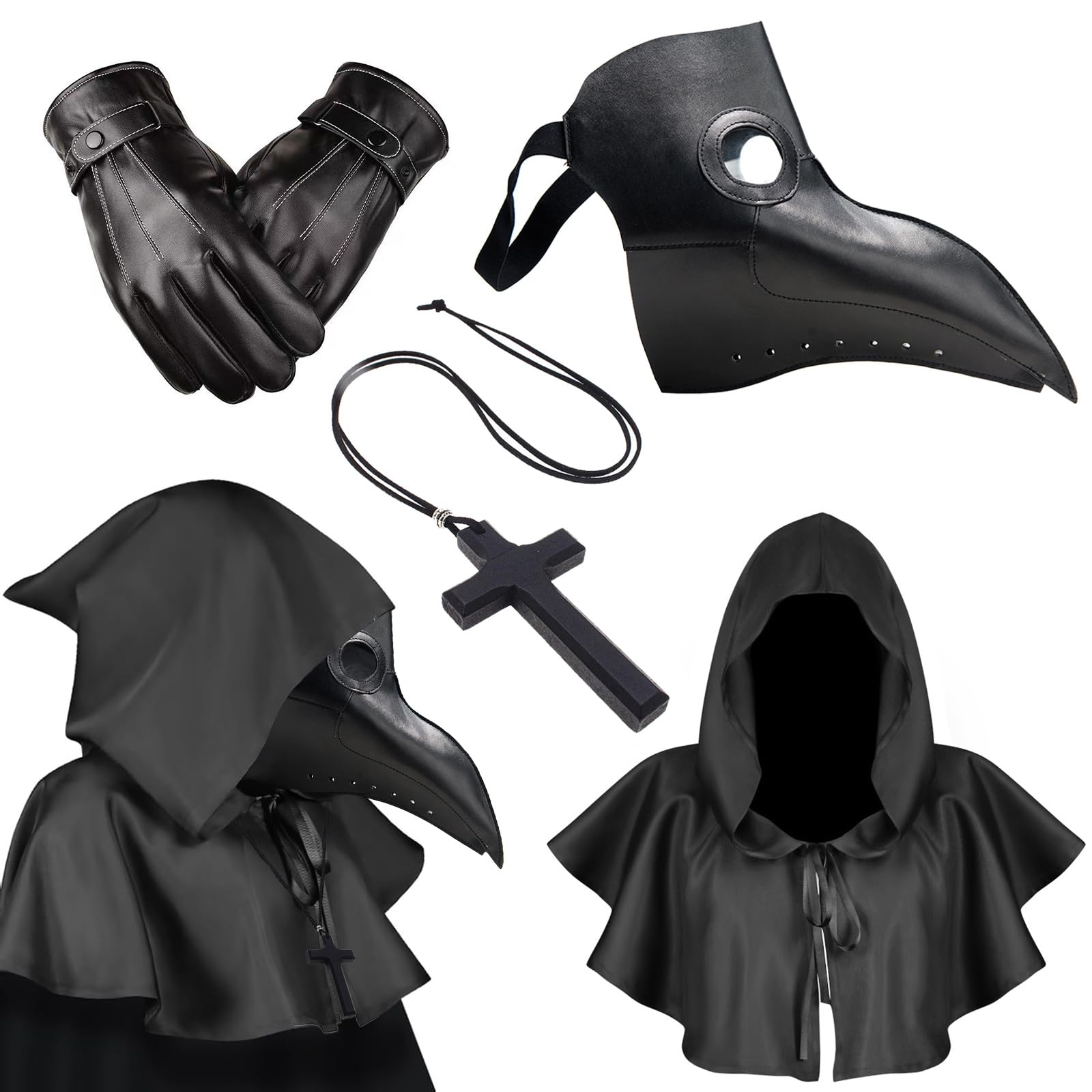 Plague Doctor Mask Halloween Black Long Nose Bird Beak Steampunk Leather Bird Mask Gothic Plague Doctor Costume Hooded Cloak Cross Necklace Gloves Halloween Props Costumes for Carnival Party Cosplay