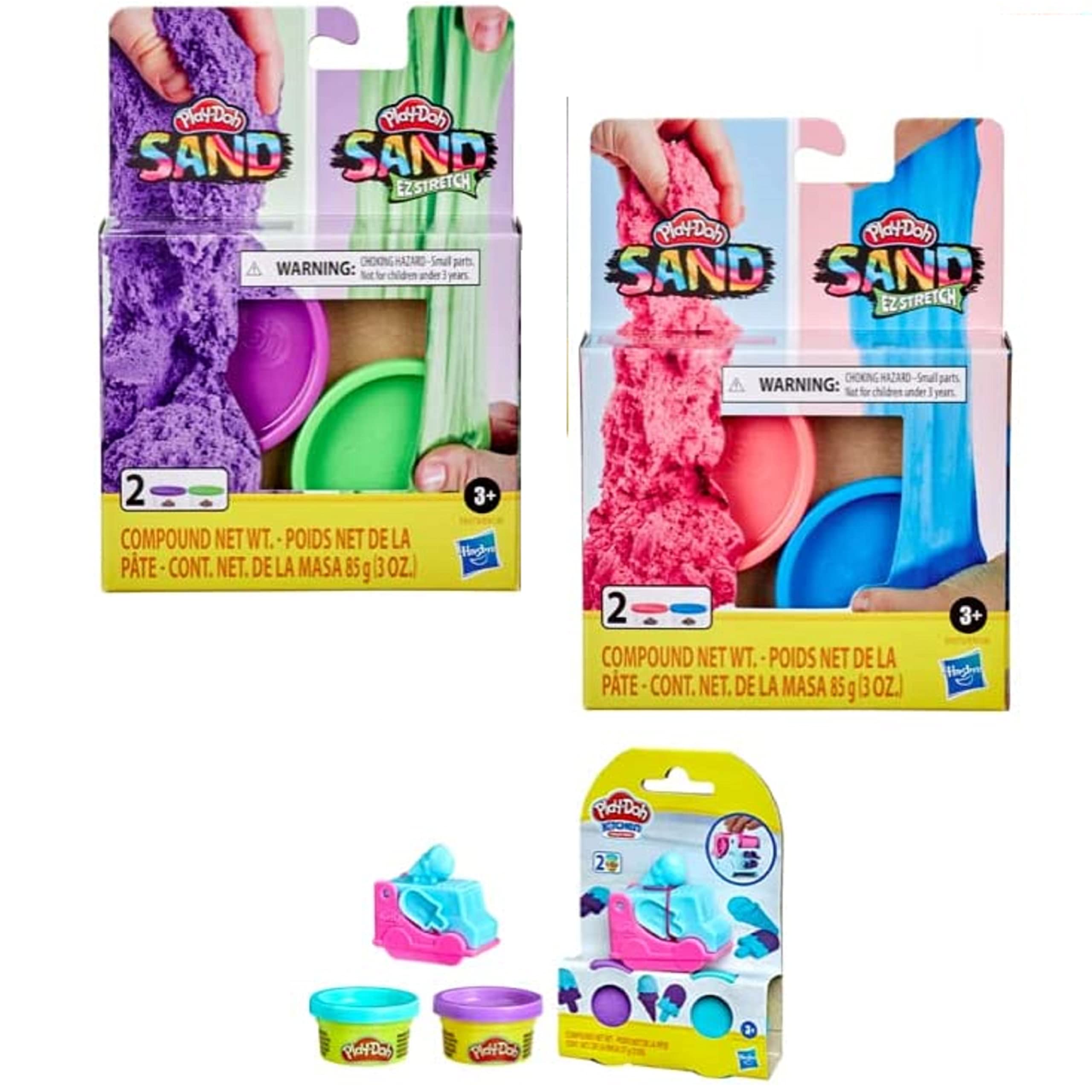 GIFTABLE, PORTABLE, AND IRRESISTIBLE: Toss these in your sensory bin for tactile and visual activities, take it along on travel, or use it as a stocking stuffer, party favor, or as a fun way to relax Includes 3 cans of Play-Doh Sand and 2 cans of Play-Doh Sand EZ Stretch compound (total net weight 9 ounces). Ages 3 years and up Purchasers will receive 3 color varieties. Not intended to be eaten. Non-Toxic. Conforms to: ASTM D-4236. Warning: Choking Hazard - Small parts. Not for children under 3 years. Compound may stain. Adult supervision recommended. Keep away from rugs and fabrics. Product may stick to or stain some surfaces. Product and colors will vary.