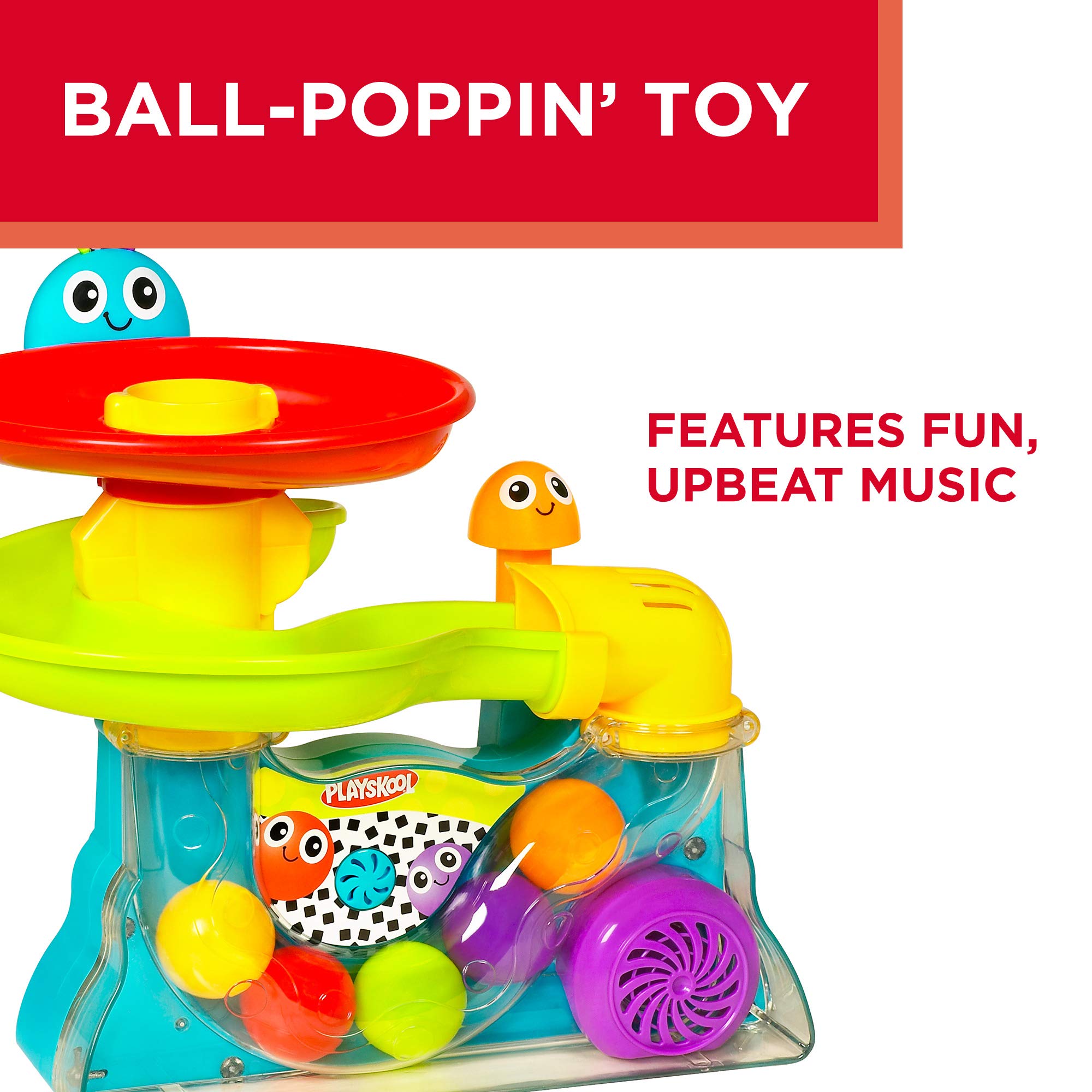 Amazon.comThe Playskool Explore and Grow Busy Ball Popper is a great put-and-take adventure for your infant or toddler. Designed for children ages nine months and up, the Busy Ball Popper will have your child popping the bright, colorful balls into a fun frenzy as they are air-popped out of the lower tube. The ball spinner/popper provides a fun sensorial experience, and includes fun, upbeat music to match the bright colorful characters.Explore and GrowBusy Ball Popper Ages: 9 months and upRequires: 4 "D" batteries (not included) Phillips screwdriver Adult assembly What We ThinkFun factor:Durability:Ease of assembly:Educational factor:The Good: An exciting sensorial, put-and-take toy for your infant/toddler.The Challenging: Could be damaged if dropped or thrown repeatedly.In a Nutshell: A colorful toy that pops balls into the air or onto the ground for chasing.Watch the fan pop the colorful balls into the air! View larger.Colorful Balls that Spin and Pop in the AirThe Busy Ball Popper is a one-piece toy that's made up of a removable ball trough, tube, and tray. When your child presses down on the big-eyed mushroom character on the Ball Popper, the balls move up the tube and pop out of the top, falling back into the tray to start the process all over again.The popper is made to withstand the rigors of your infant's play and can be easily cleaned with a damp towel. The plastic balls are large enough that you will not have to worry about them as choking hazards, but when your child is popping the balls, make sure to keep an eye out for balls as they can go off of the track occasionally. The popper also includes eight lively songs that start once you have pumped down the plunger to activate the ball-popping fan.Keep in mind that although the Busy Ball Popper is made out of a strong, durable plastic, it is fairly heavy and should be kept on a flat surface while being played to avoid any damage to your furniture. The toy also shuts itself off after a short period of time, but it is recommended to always turn it off manually for battery conservation.Great Sensorial, Put-and-take Work For Your ChildThis ball popper is a great toy for infants gaining gross motor skills, or for toddlers who are ready to chase the balls around the house and dance to the upbeat music. It is visually appealing with its bright, colorful balls and characters, and you never know where the balls may land, making it an exciting and new adventure each time.What's in the BoxBall popper base, plastic ball tray and lower trough, and five plastic balls. (Batteries are not included.)Product DescriptionYour busy baby or toddler can get silly with poppin’, droppin’ colored balls! When they press the smiley faced button, they can drop a ball onto the spiral track. When the balls reach the bottom, SURPRISE - they pop out the top and the fun starts all over again! The Playskool Explore ‘N Grow Busy Ball Popper features 8 lively songs, fun sound effects, and 5 colorful balls. Best of all, your child can practice using their fine and gross motor skills and with your help they’ll have the opportunity to learn about cause and effect.